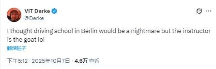 "原本以为在柏林上驾校会是场噩梦,但这个教练是GOAT啊哈哈哈。"