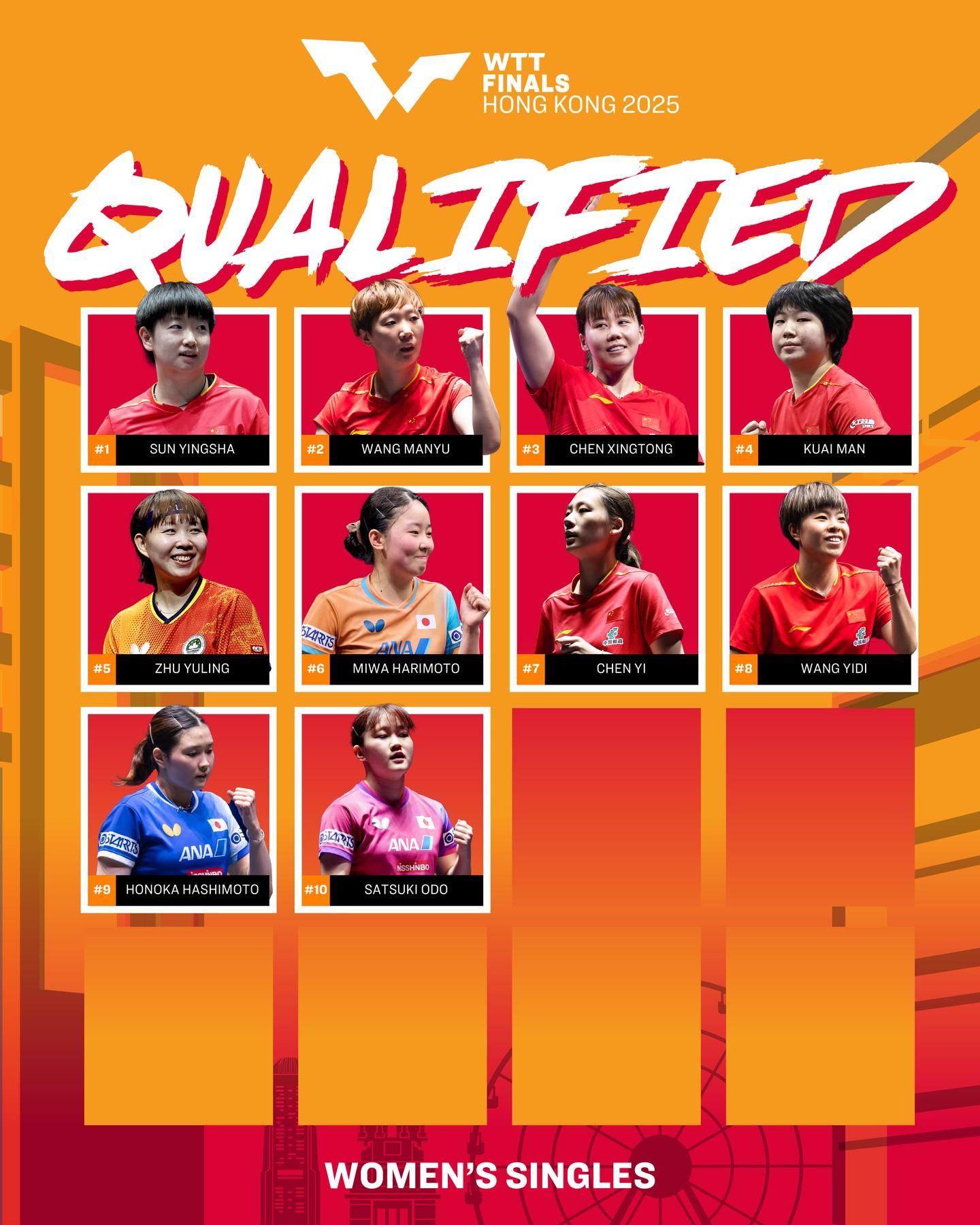 虎扑10月07日讯WTT香港总决赛将于12月10日至12日举行。WTT世界乒联发布截至目前获得2025WTT香港总决赛参赛资格的名单:
