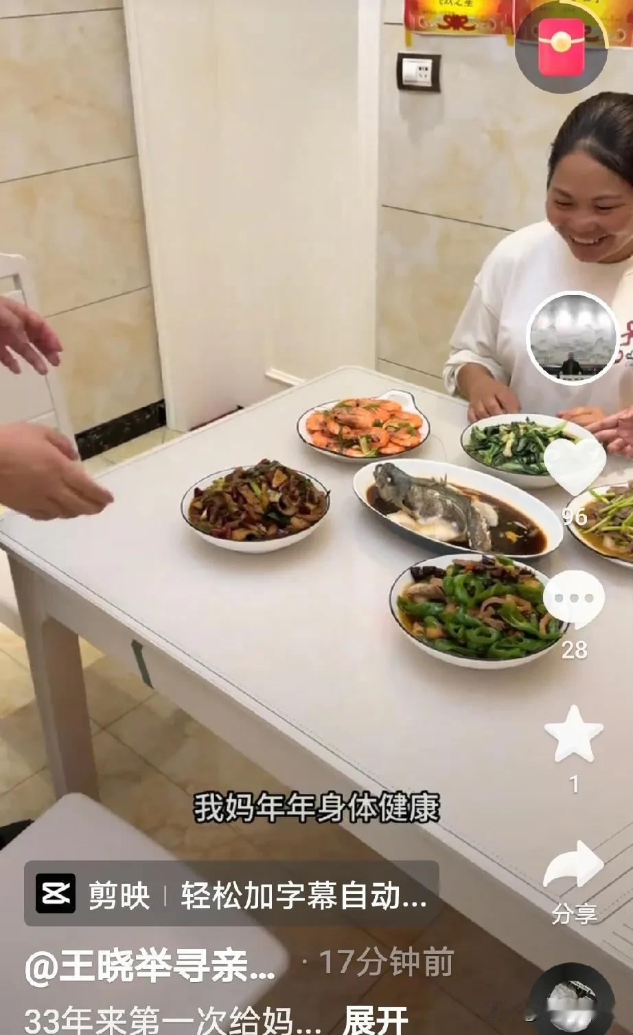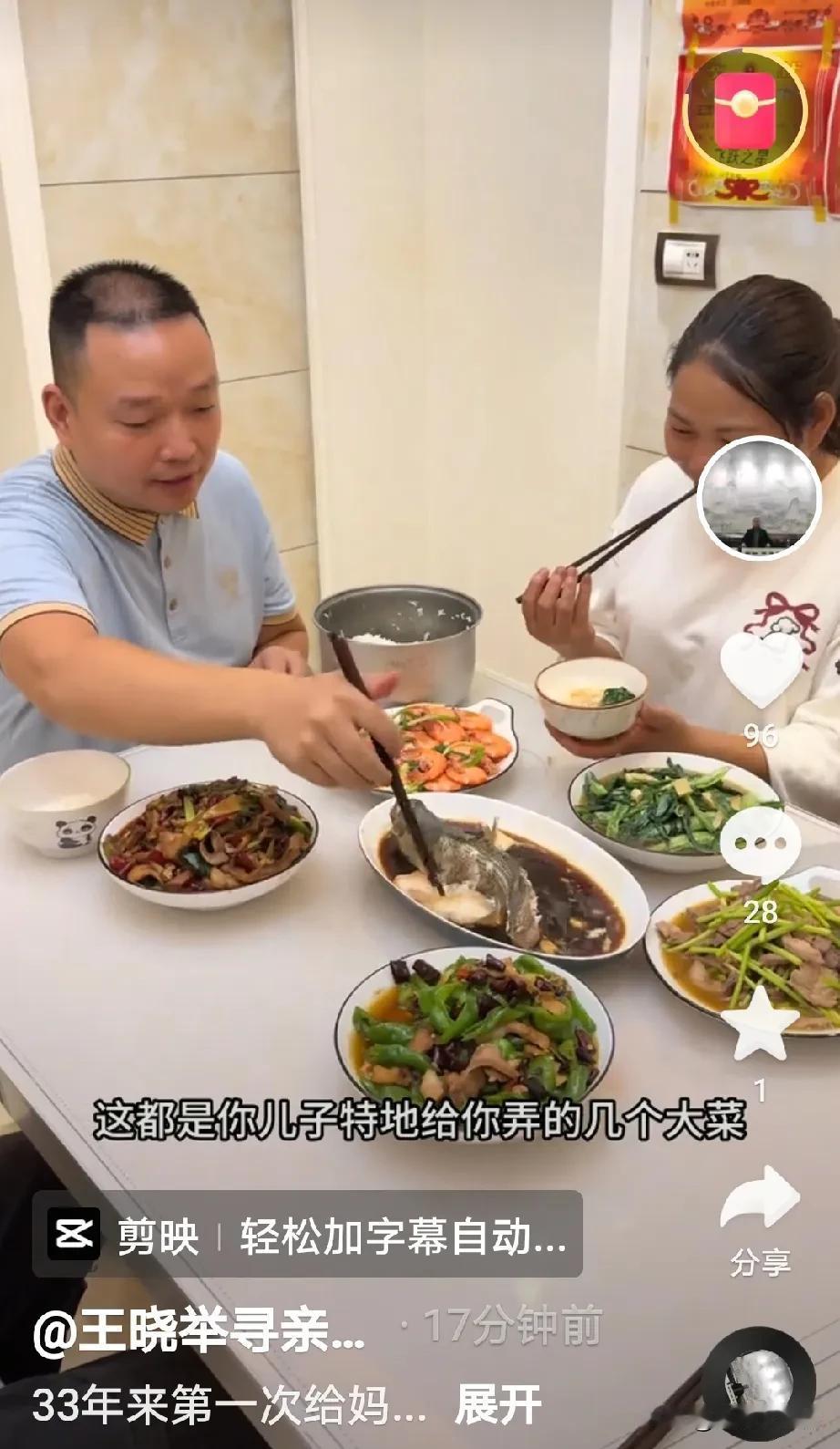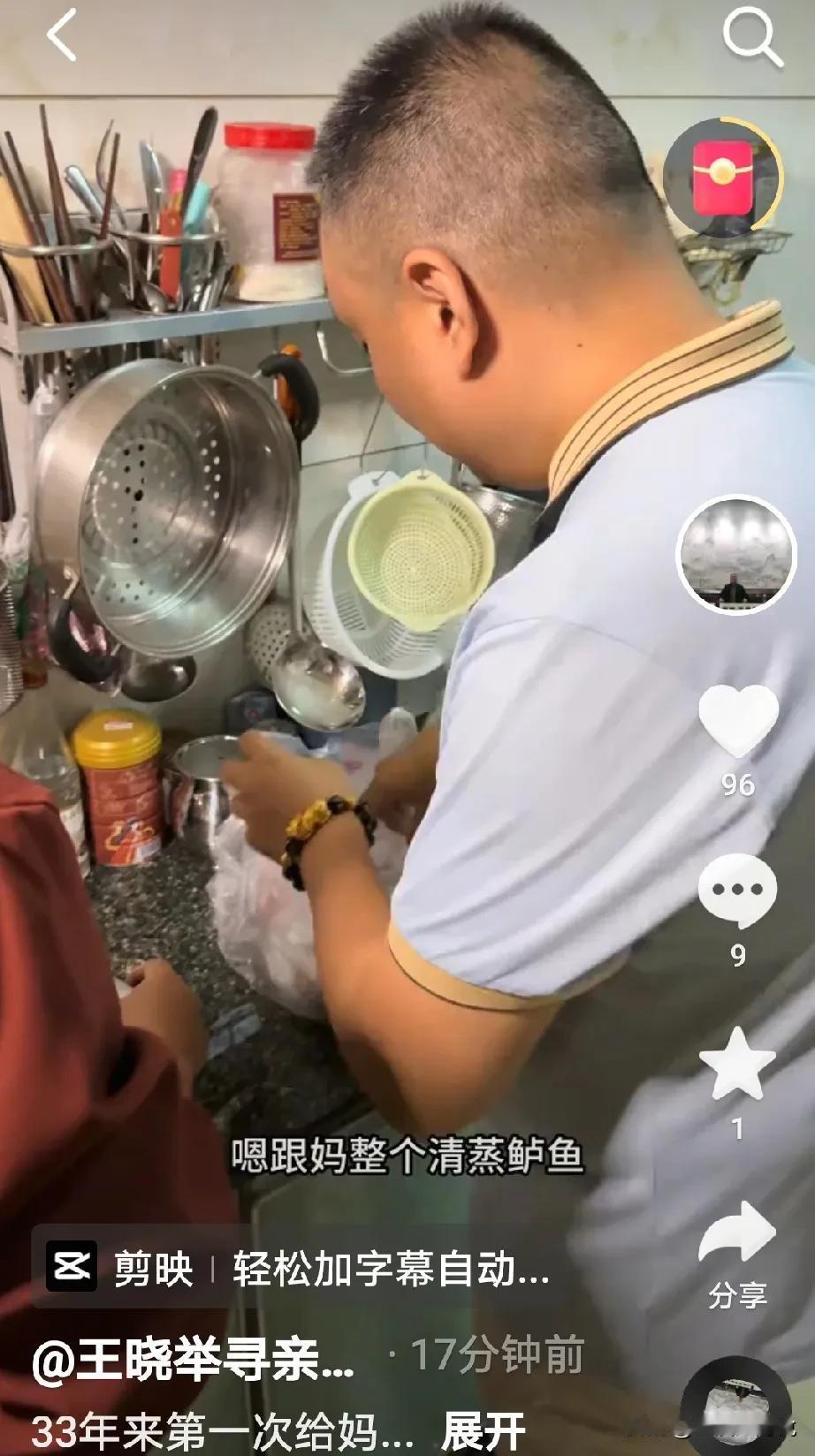 王晓发视频称:33年以来这是第一次给妈妈做饭吃, 妈妈吃的很好,我很开心,