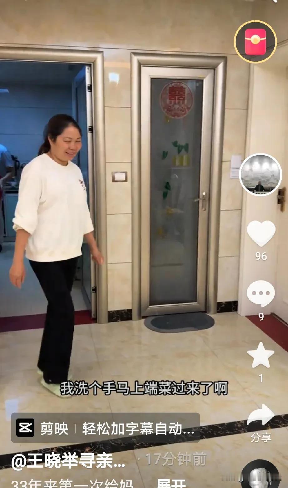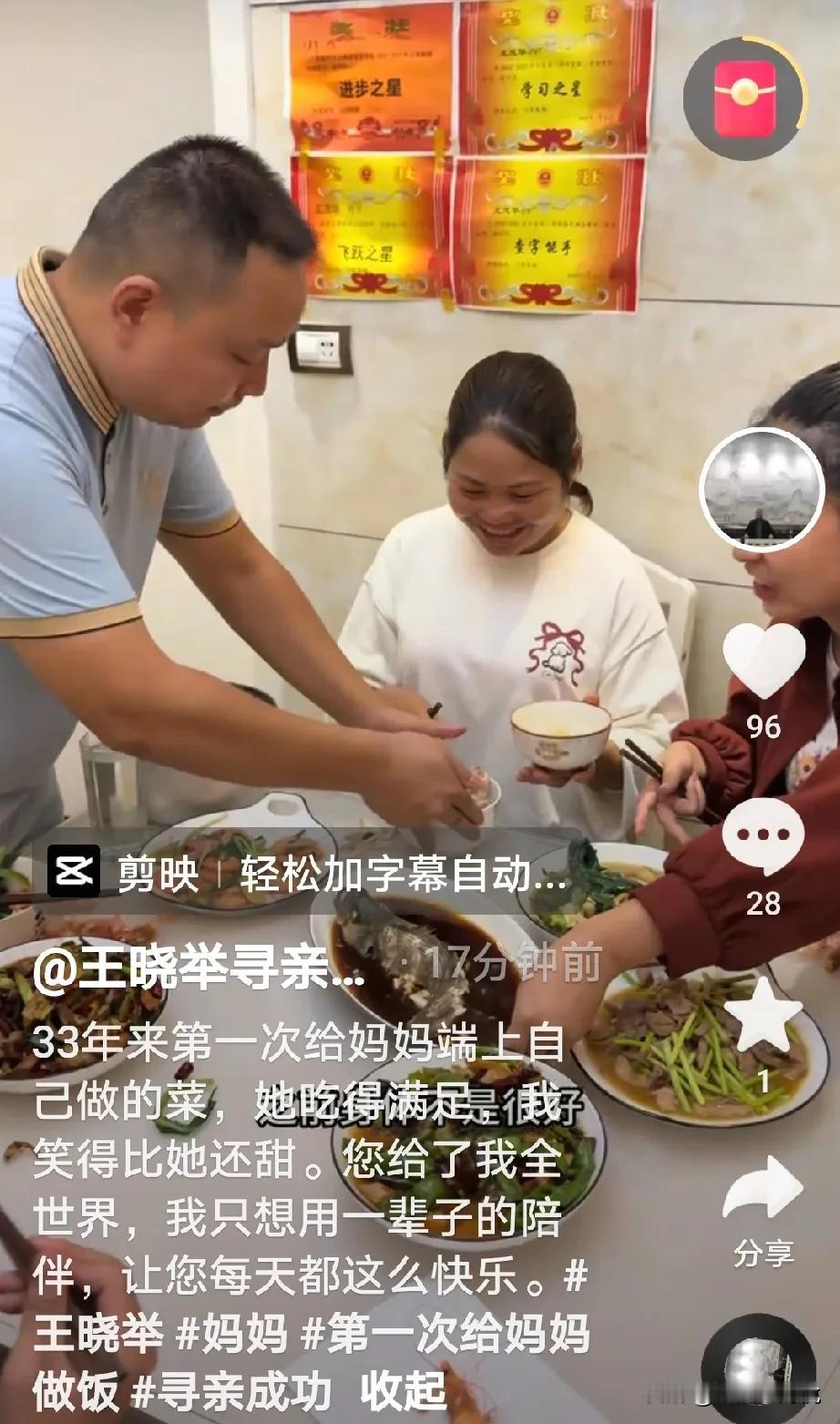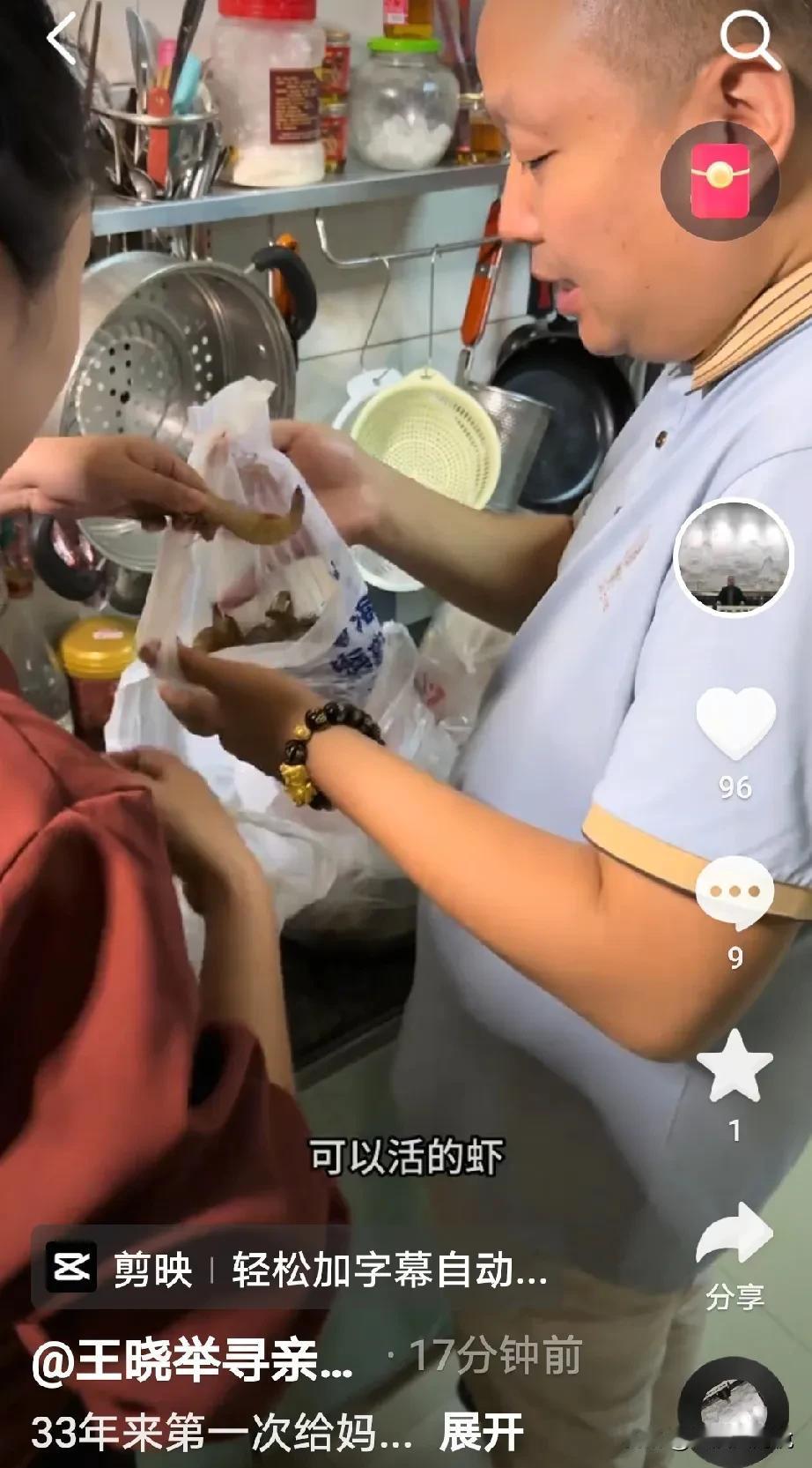 王晓发视频称:33年以来这是第一次给妈妈做饭吃, 妈妈吃的很好,我很开心,