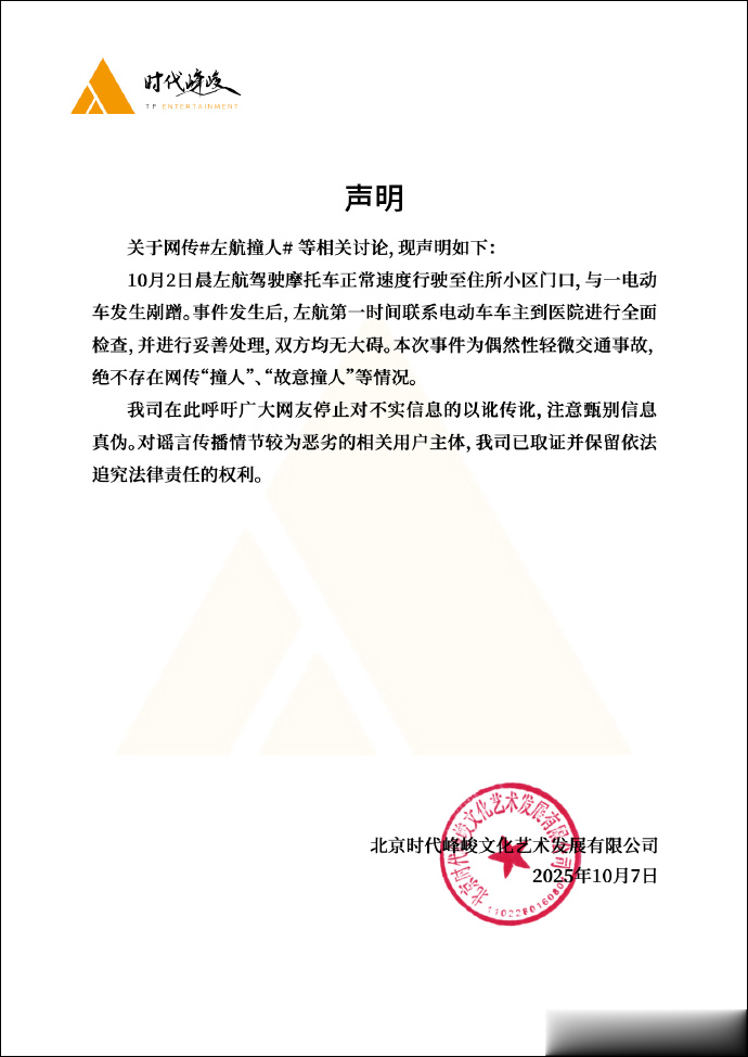 刚刚,时代峰俊公司回应旗下艺人“左航撞人”传闻: