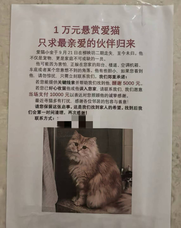 近日,良渚文化村有人贴出寻猫启事:爱猫小金于9月21日在柳映坊二期走丢,至今未归,不仅是宠物,更是家庭不可或缺的一员。可能因为害怕,正躲在您家阳台、楼道、空调机箱、车底或某个您意想不到的角落。如果您看到,请勿惊扰,只需立刻联系我们。