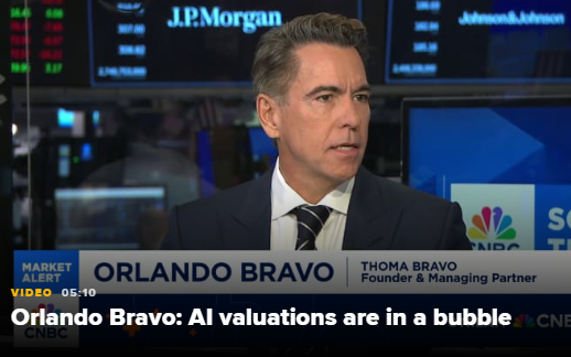索玛布拉沃(ThomaBravo)私募股权公司联合创始人奥兰多・布拉沃表示,人工智能企业的估值“已陷入泡沫”,并将当前情况与互联网泡沫时代进行了类比。