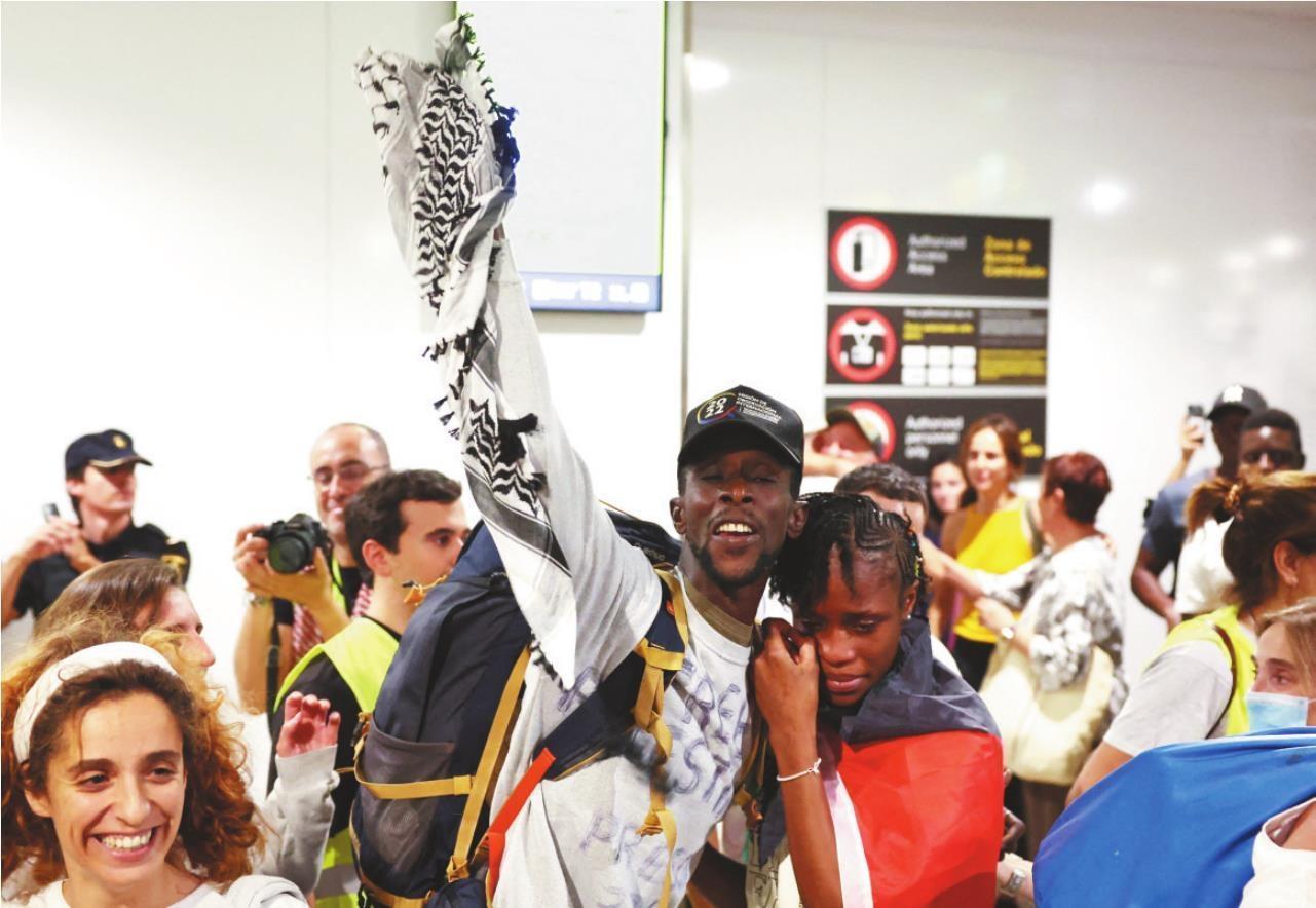 “全球坚韧船队”成员来自40多个国家和地区,他们寻求打破以色列自2007年以来对加沙地带的海上封锁,上月开赴加沙运送援助物资。1日晚至3日,以军拦截并控制了船队的全部42艘船,扣押400多人,并从3日起办理遣返手续。图为10月6日,遭以方扣押的赴加沙船队的西班牙人员抵达西班牙马德里巴拉哈斯机场。