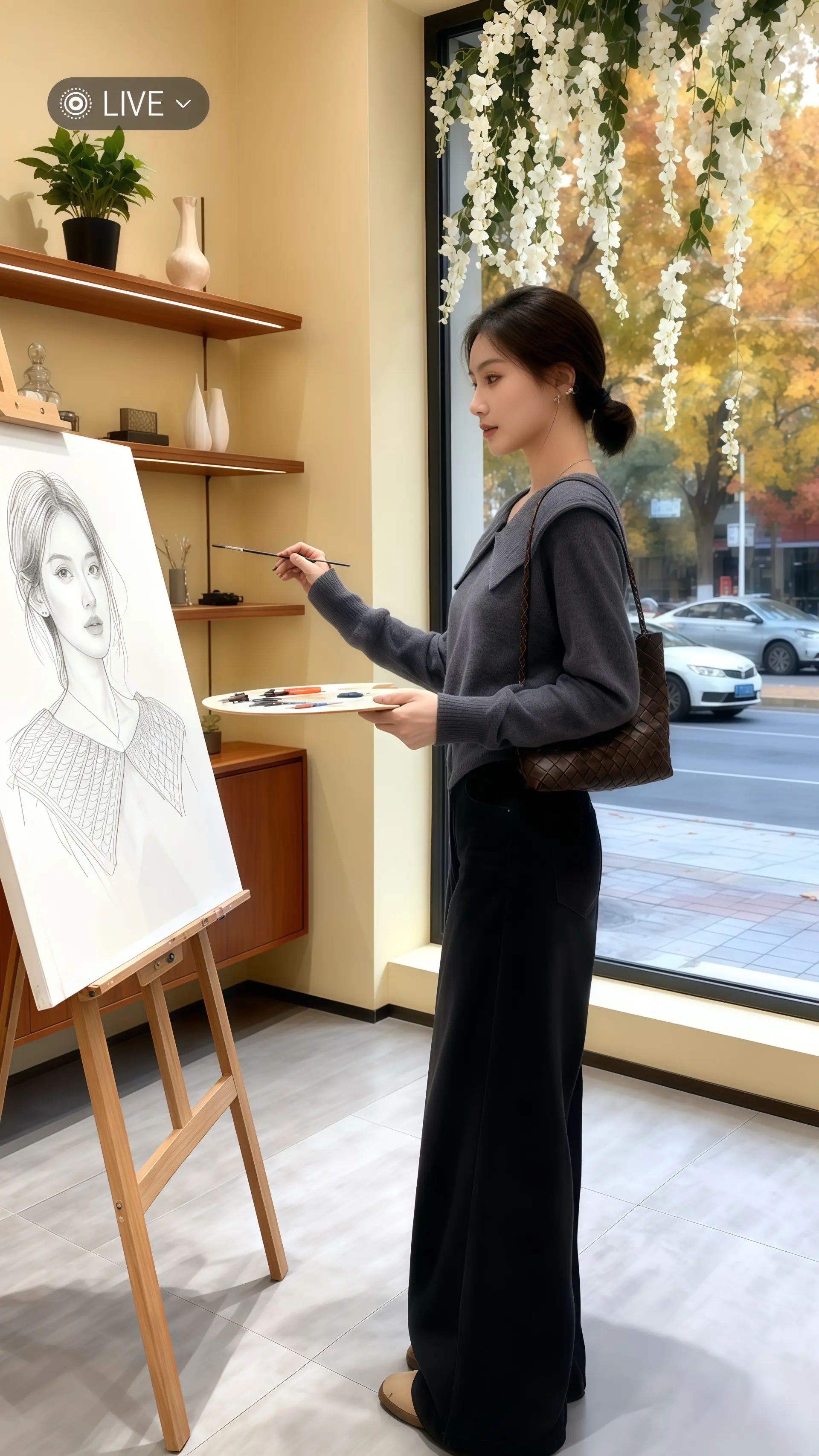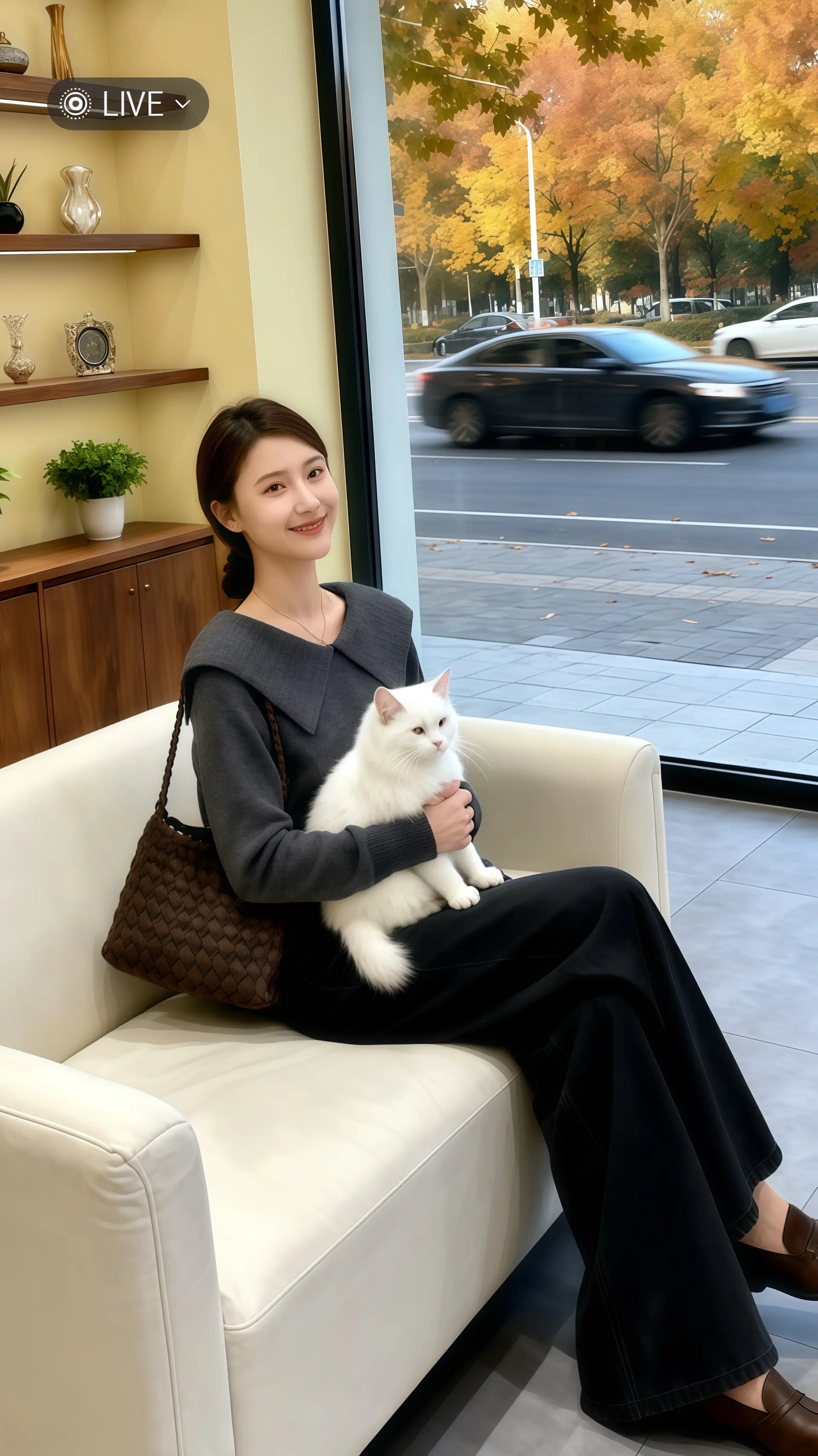 她穿着韩系显瘦翻领针织毛衣,深灰色的质感在暖光里晕出温柔轮廓。领口的编织细节精致又显气质,搭配阔腿牛仔,把韩系的慵懒与高级感揉得恰到好处。在这间轻奢风女装店里,浅灰地板映着米白墙的实木置物柜,绿植与装饰错落成景。落地窗外,秋意把街道染成暖色调,汽车驶过带起落叶纷飞,窗顶的白色花藤垂落如瀑。她指尖轻触桌旁的白色小猫,浅浅的微笑里,是针织毛衣的温柔,是韩系穿搭的精致,更是秋日里独一份的治愈与高级。