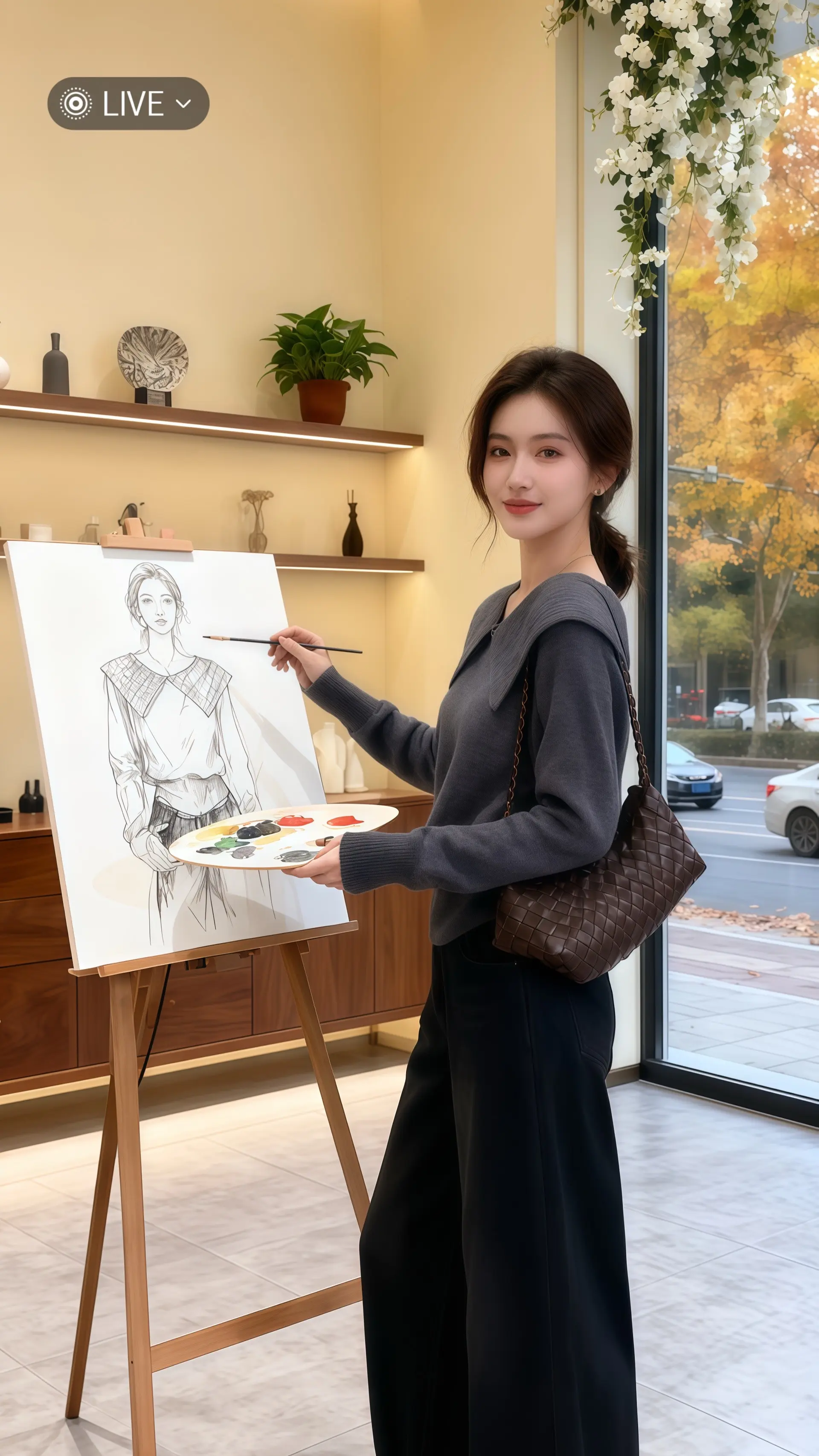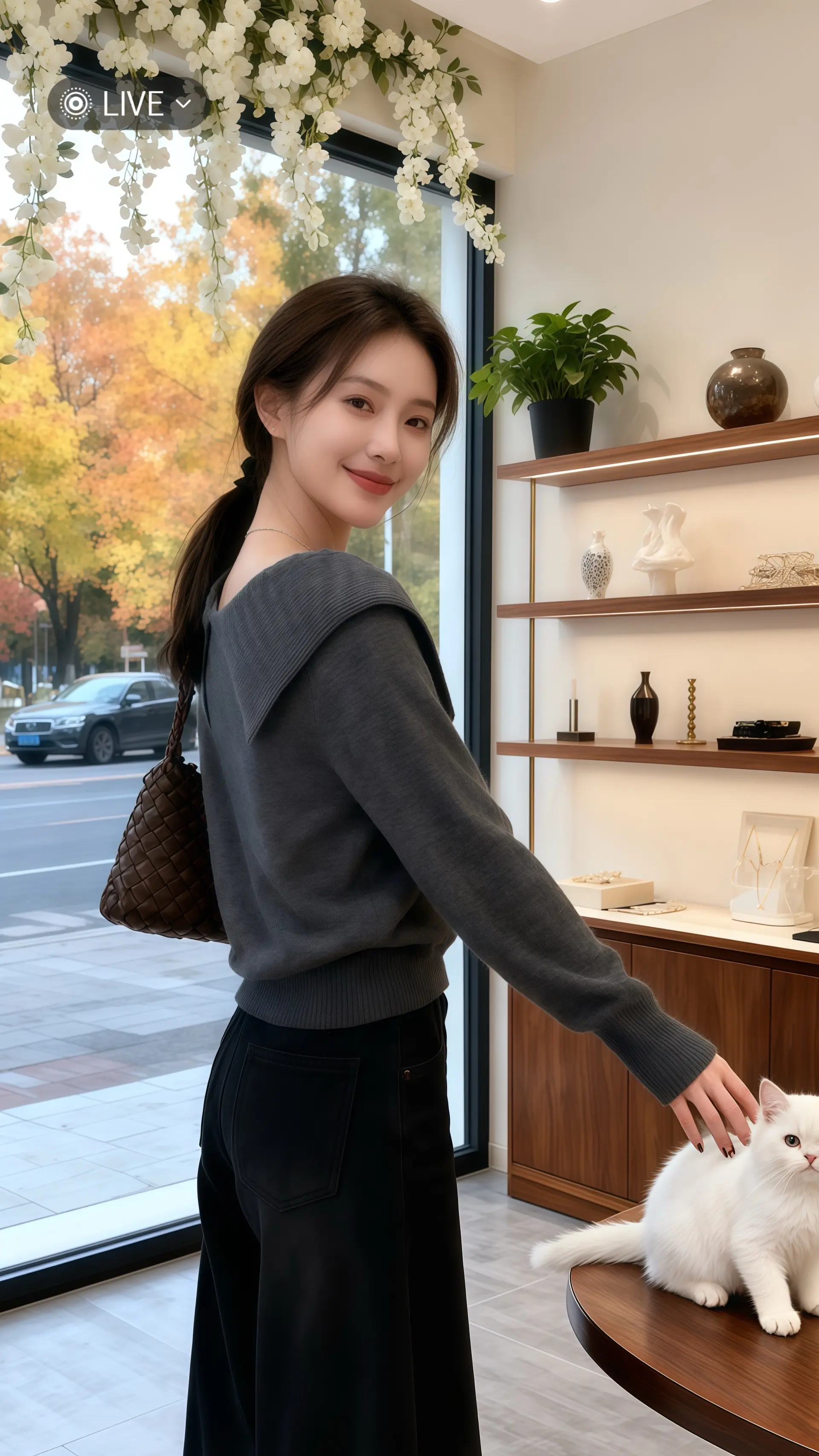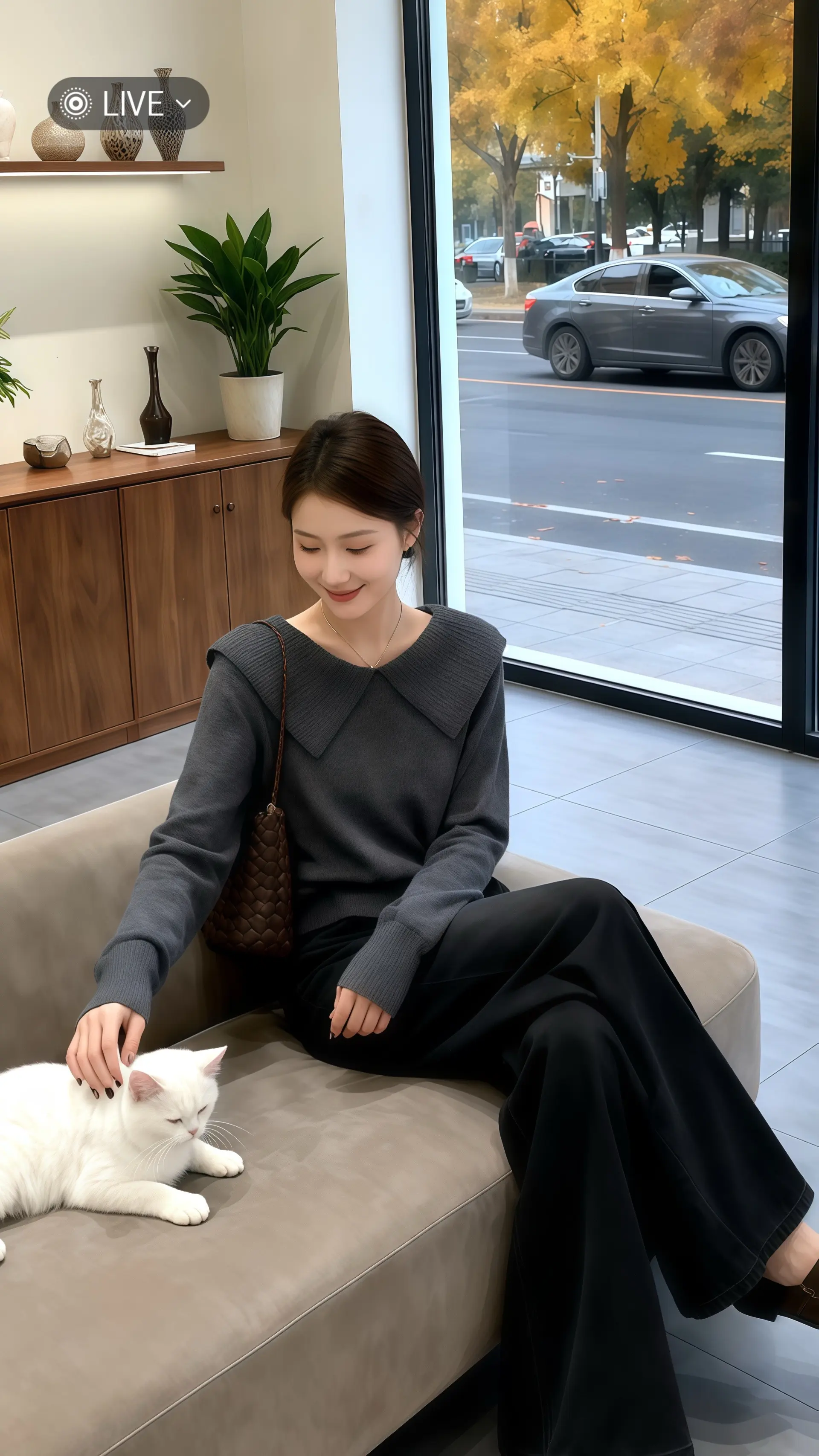 她穿着韩系显瘦翻领针织毛衣,深灰色的质感温柔又高级,领口的精致纹路为整体造型注入了几分复古韵味。在这处温馨的室内,浅灰地板与米白墙面上的实木置物柜相得益彰,柜上的绿植与装饰品点缀出轻奢质感。落地窗外,秋天的风裹挟着落叶掠过街道,行驶的汽车为这静谧的画面添了几分烟火气,顶上垂落的白色花藤更显浪漫。她或轻触柜上的白色小猫,或在浅色沙发上浅笑,每一个姿态都将韩系穿搭的优雅与秋日的温柔,揉成了一首关于风格与季节的诗意短章。