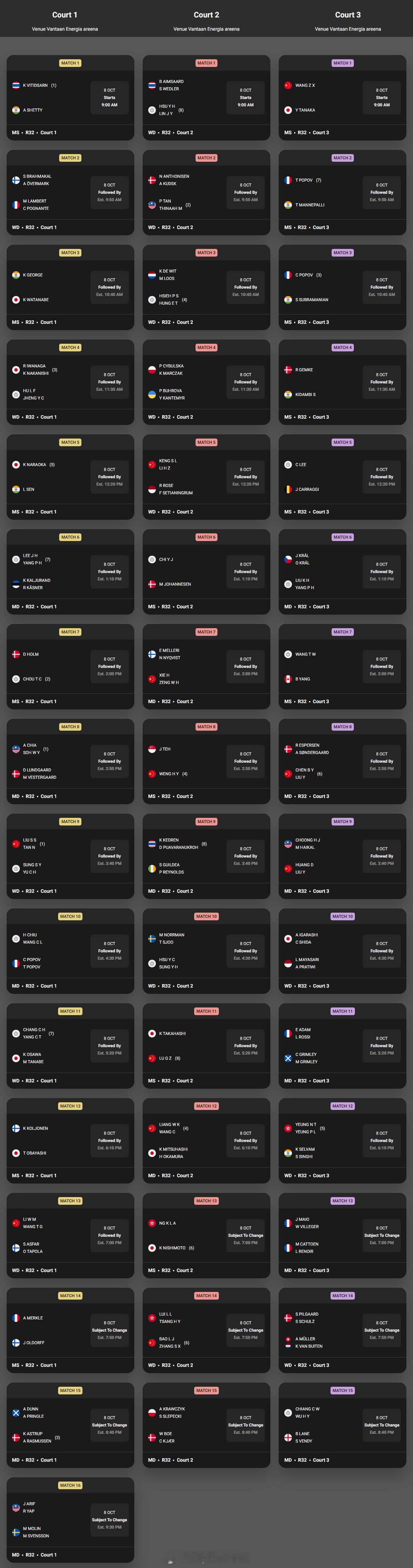 【北极羽毛球赛次日赛程对阵】2025年北极羽毛球公开赛羽联超级赛 10月8日芬兰万塔,2025世界羽联超级500北极公开赛将继续首轮争夺,首日比赛将于北京时间14时开始,国羽赛程对阵如下,完全赛程对阵见图: