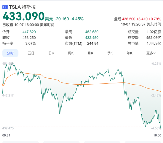 特斯拉股价尾盘跳水,最终收跌4.45%,完全抹去昨日的涨幅。