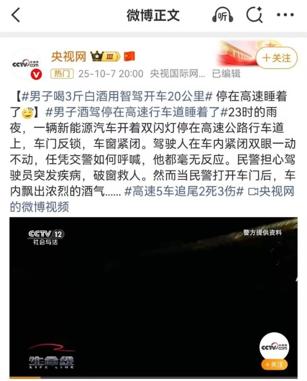 据央视网官方微博10月7日晚上8时许报道23时的雨夜,一辆新能源汽车开着双闪灯停在浙江杭州的一条高速公路行车道上,车门反锁,车窗紧闭。驾驶人在车内紧闭双眼一动不动,任凭交警如何呼喊,他都毫无反应。民警担心驾驶员突发疾病,破窗救人。然而当民警打开车门后,车内飘出浓烈的酒气。男子告诉交警,他连续喝了两场酒,一共约3斤白酒。此事引起网友热议。