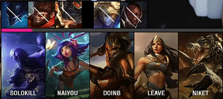 NIP选用:solokill鳄鱼;naiyou皇子;Doinb瑞兹;Leave希维尔;Niket妮蔻