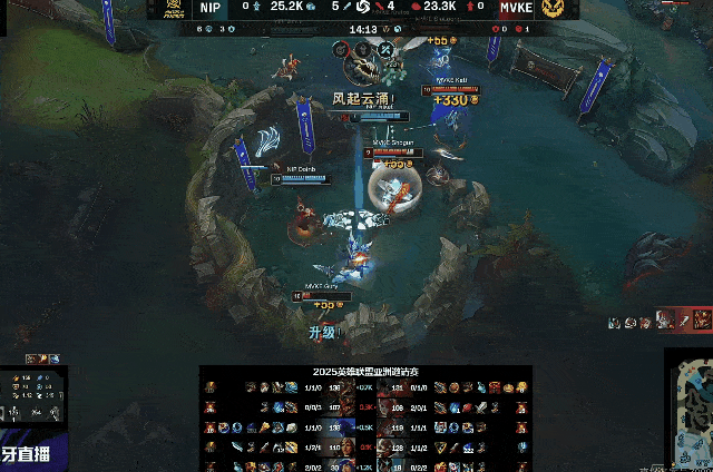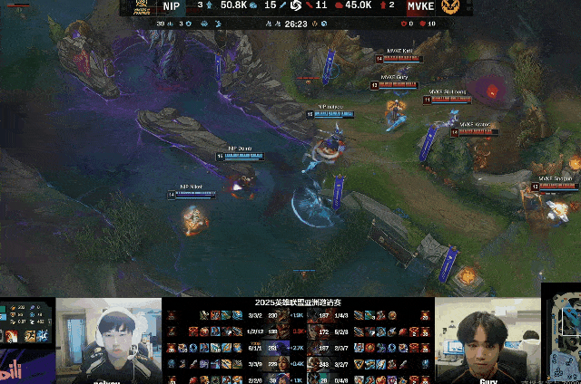 15分钟,VKE阿萝拉传送落地被秒,随后NIP持续追击完成0换2
