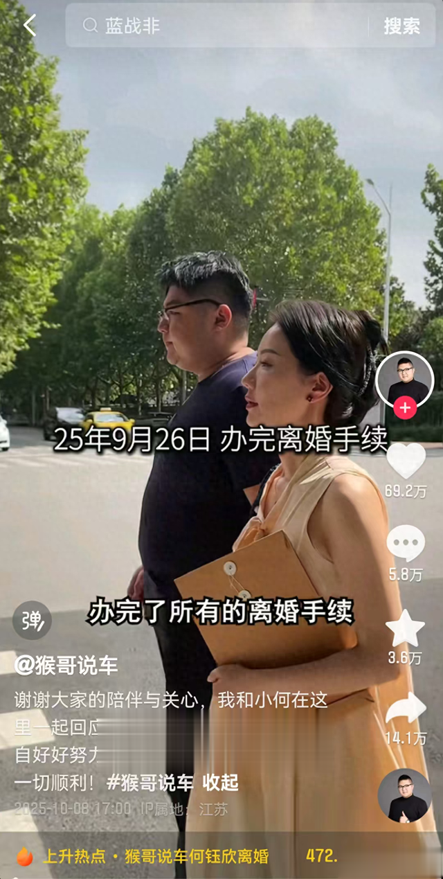 10月8日,千万粉丝网红“猴哥说车”发布视频称,自己与何钰欣已在9月26日办理离婚手续,“缘分尽了,和平离婚”“生活不是剧本,总会有一些意料之外的分歧”。
