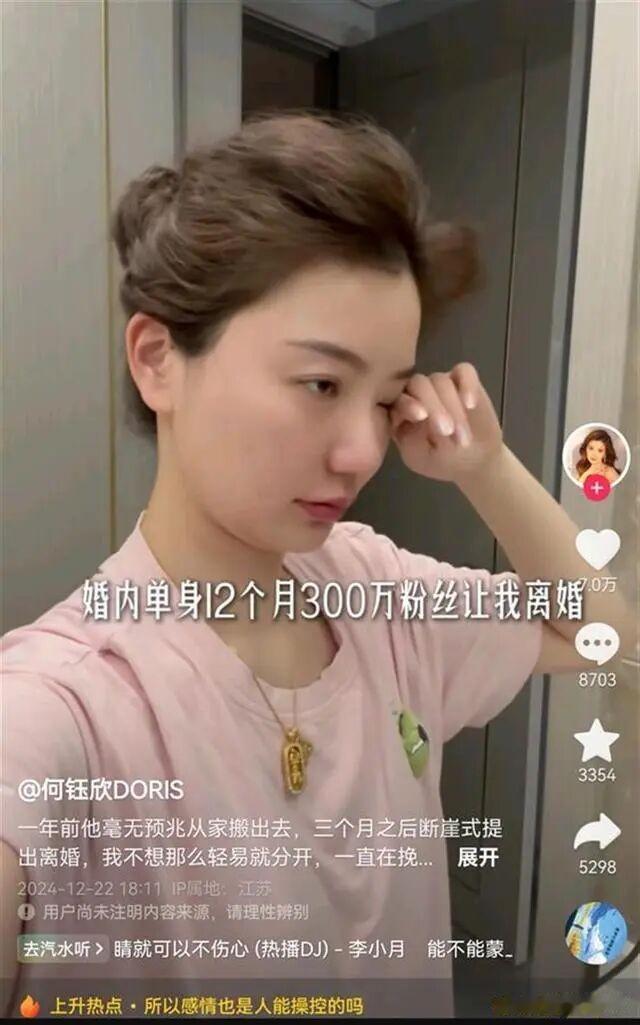 但是2024年12月初,何钰欣发布视频称,去年丈夫毫无预兆地提出离婚,她坚持不离婚。10月丈夫态度转变,她给了丈夫十五天时间,然而这期间丈夫没有主动发信息关心她,还称每天在出差。她觉得丈夫只是想堵住网友的嘴,并非真心想修补感情。