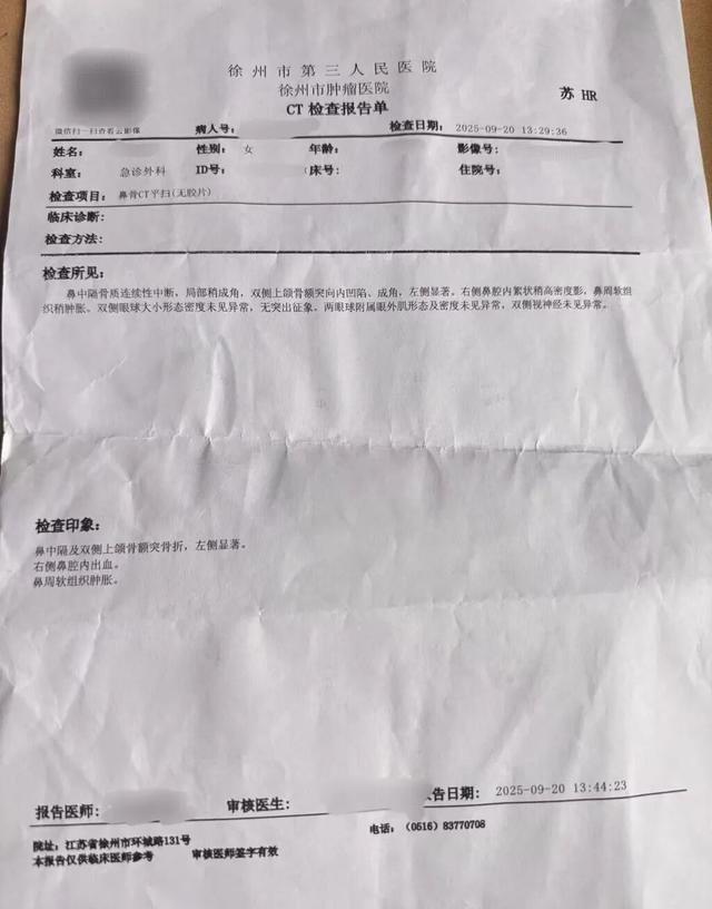 刘女士提供的一份9月20日下午的“CT检查报告单”显示,“鼻中隔及双侧上颌骨额突骨折,左侧显著。右侧鼻腔内出血。鼻周软组织肿胀。”20日14点左右,在医院处理伤口期间,刘女士丈夫尝试联系“抖音生活服务售后官方客服”,并于当天下午向人工客服提供了车祸的照片、病历等,希望全额退票。经多次沟通,对方以退票规则为由,拒绝全额退票。