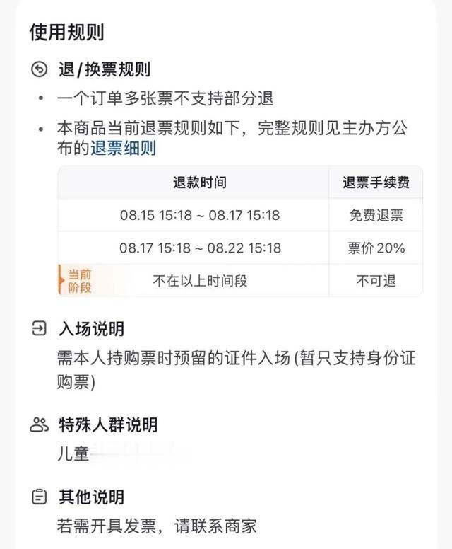 刘女士提供的票务方的退换票规则截图显示,此次演唱会门票在8月15日15:18分至17日15:18分期间,可“免费退票”;8月17日至22日期间退票需收取“票价20%”作为手续费;8月22日后的时间段,不接受任何形式退票。