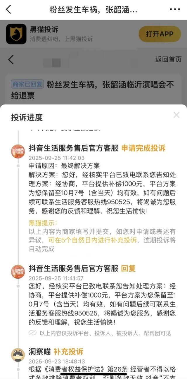 江苏徐州的刘女士近日向澎湃公众互动平台“服务湃”称,此前,她丈夫在抖音一账号的直播间内购买了两张张韶涵演唱会门票。演唱会当天,她因遇车祸无法到场,想全额退款遭拒。票务代理公司表示,时间不在可退范围内,无法全额退票。抖音平台表示,给用户补偿1000元。
