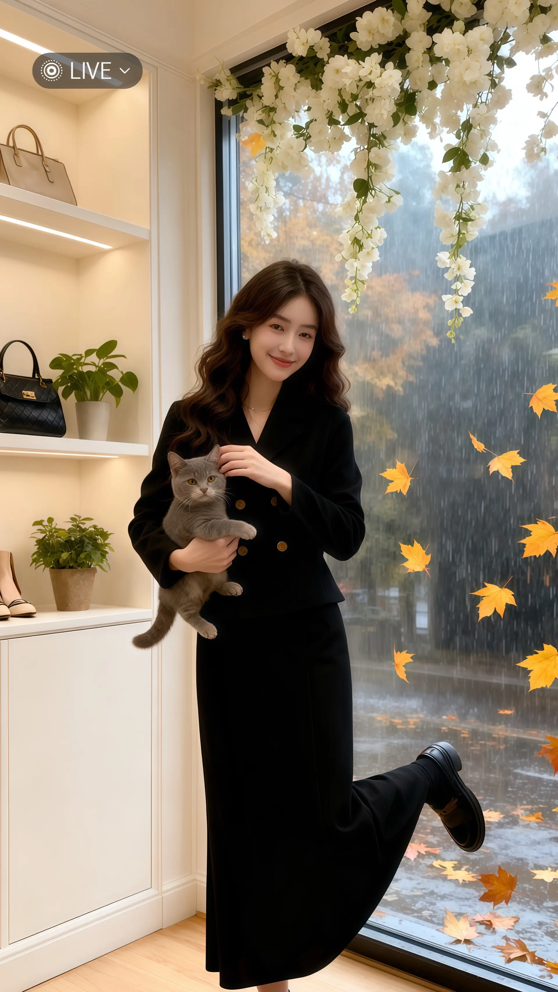 她穿着秋冬新款时尚灯芯绒收腰外套半身裙两件套,在窗前静坐成一幅雅致的画。暖棕的灯芯绒自带复古质感,收腰设计勾勒出曼妙曲线,半身裙的伞摆随微风轻晃。窗外,秋意正浓,金黄的叶在雨丝里打着旋儿,远处的街景被晕染成朦胧的油画。她指尖轻触窗沿,看落叶与雨珠共舞,任时光在这温暖的穿搭与诗意的秋景间,缓缓流淌,每一寸都透着从容与精致,把秋冬的时尚与季节的浪漫,都穿在了身上,藏进了眼里。