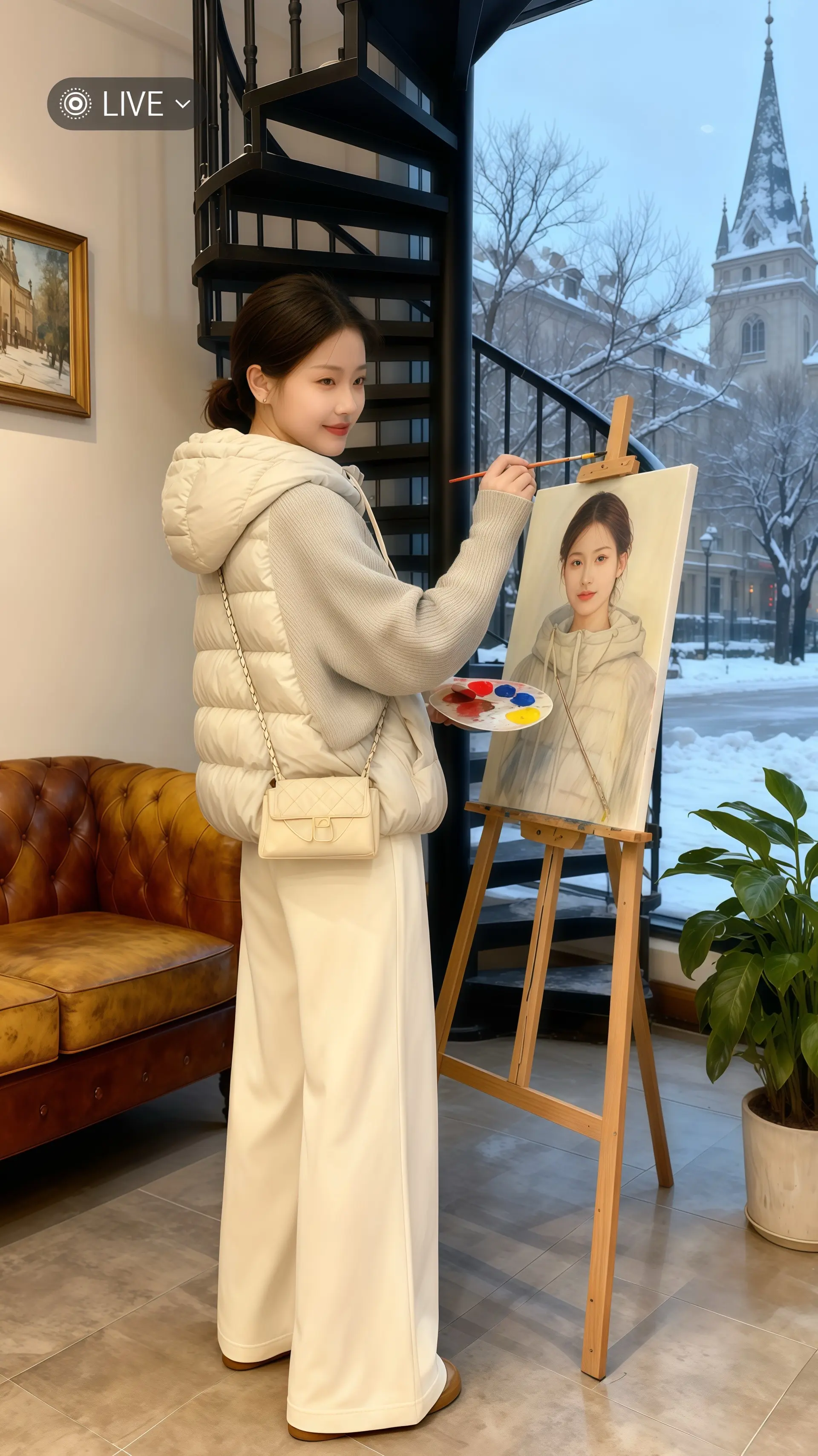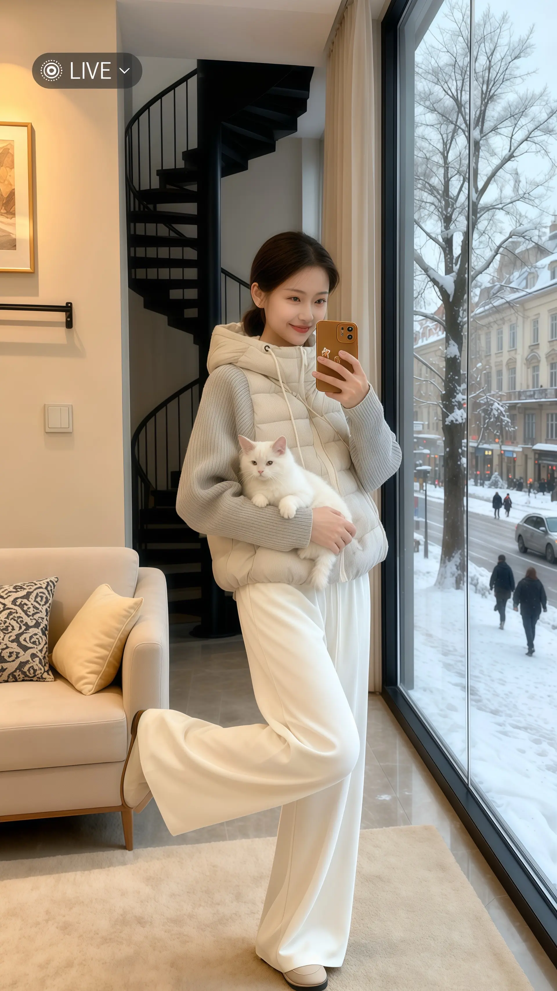 她穿着冬季新款针织假两件拼接棉服外套,柔和的米色调与针织纹理的碰撞,在暖光里漾出别致的时尚感。慵懒窝在米色沙发上,指尖划过杯沿氤氲的热气,目光却被落地窗外的冬日雪景牢牢锁住——覆雪的街道、银装的树木,欧式建筑在雪幕里晕出童话般的轮廓,连行驶的汽车都似在雪绒毯上轻滑。怀中的白色小猫乖巧蜷缩,沙发靠枕的图案与这暖冬景致相映成趣,当时尚与温馨在这一方天地交融,便把凛冬的冷意,都酿成了诗意的暖。