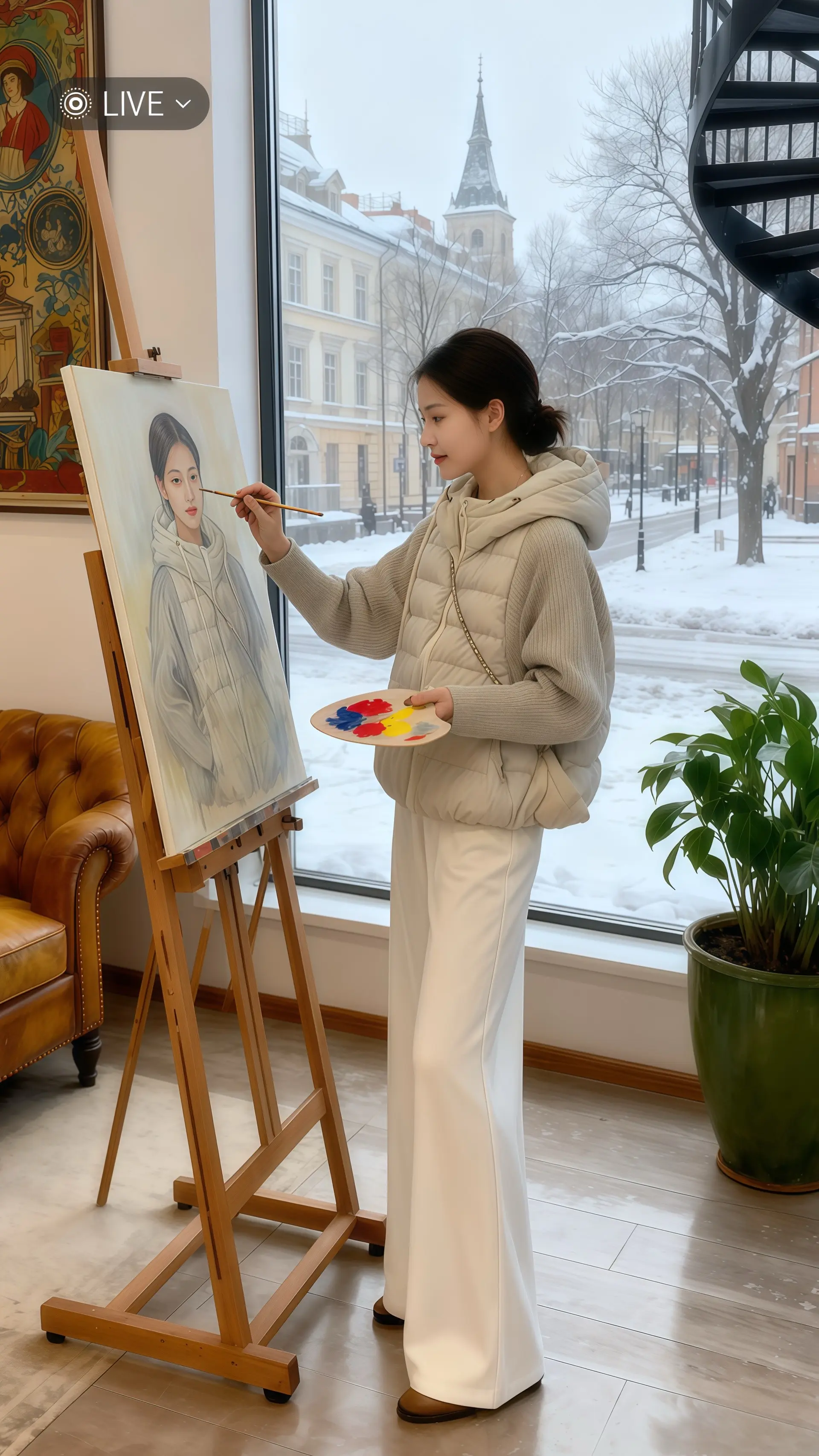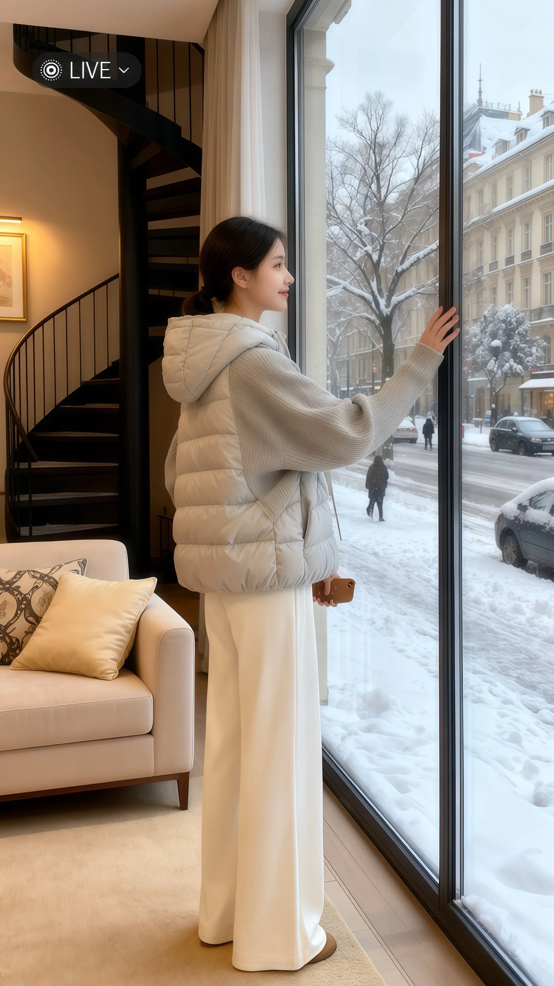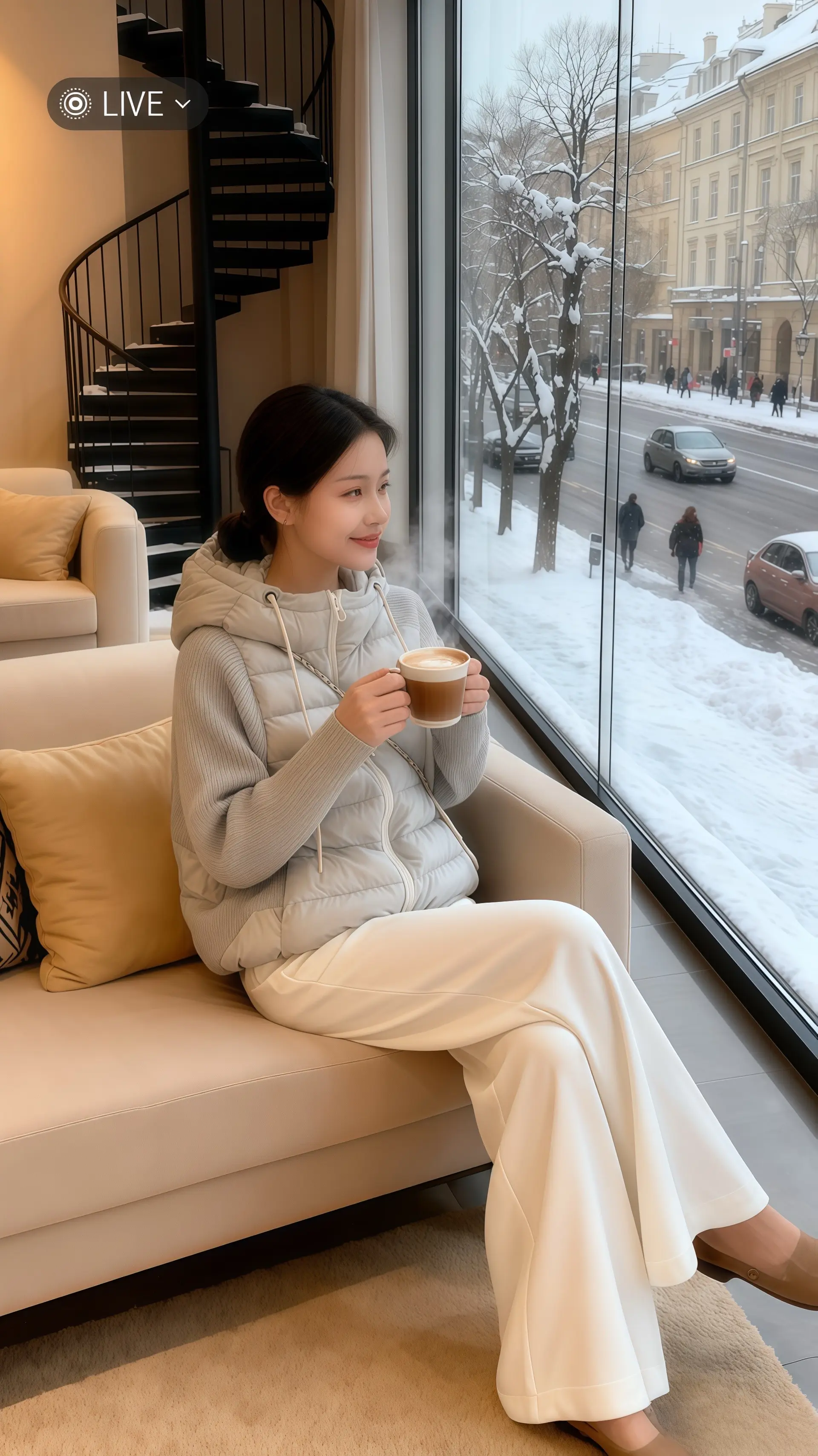 她穿着冬季新款针织假两件拼接棉服外套,柔和的米色调在暖光下更显质感,针织与棉服的拼接设计时髦又保暖。此刻她窝在米色沙发里,指尖轻触温热的咖啡杯,目光透过落地玻璃窗,追着窗外冬日雪景——覆雪的街道、银装的树木,欧式建筑顶着雪帽,汽车与行人在雪幕里勾勒出生活的律动。针织的温柔与棉服的实穿在此刻交融,既锁住了室内的暖意,又将冬日时尚的精致感,悄悄藏进每一处拼接的细节里,这般时髦又治愈的冬日,谁能不爱呢?