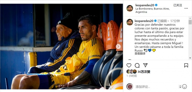 帕雷德斯社媒晒出与鲁索在替补席上的合照,写道:“感谢您如此热忱地捍卫我们的球衣,感谢您奋斗到最后一天仍与球队并肩。”