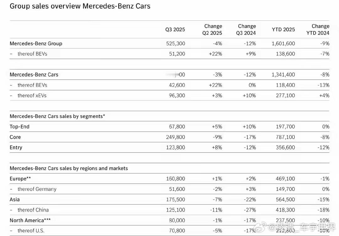 【奔驰Q3销量降12%:巨头转型的阵痛与曙光】梅赛德斯-奔驰Q3销量同比下滑12%至52.53万辆的成绩单,撕开了豪华车市场转型期的众生相。表面看是两位数的跌幅,实则藏着传统巨头在变革中的挣扎与破局。