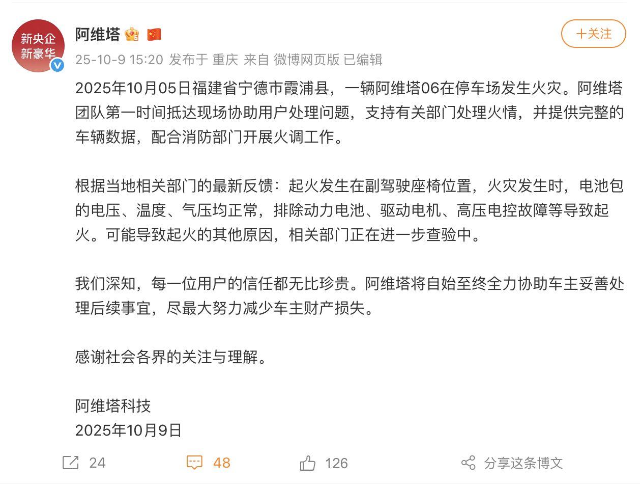 10月9日,@阿维塔发布情况说明:2025年10月05日福建省宁德市霞浦县,一辆阿维塔06在停车场发生火灾。阿维塔团队第一时间抵达现场协助用户处理问题,支持有关部门处理火情,并提供完整的车辆数据,配合消防部门开展火调工作。根据当地相关部门的最新反馈:起火发生在副驾驶座椅位置,火灾发生时,电池包的电压、温度、气压均正常,排除动力电池、驱动电机、高压电控故障等导致起火。可能导致起火的其他原因,相关部门正在进一步查验中。