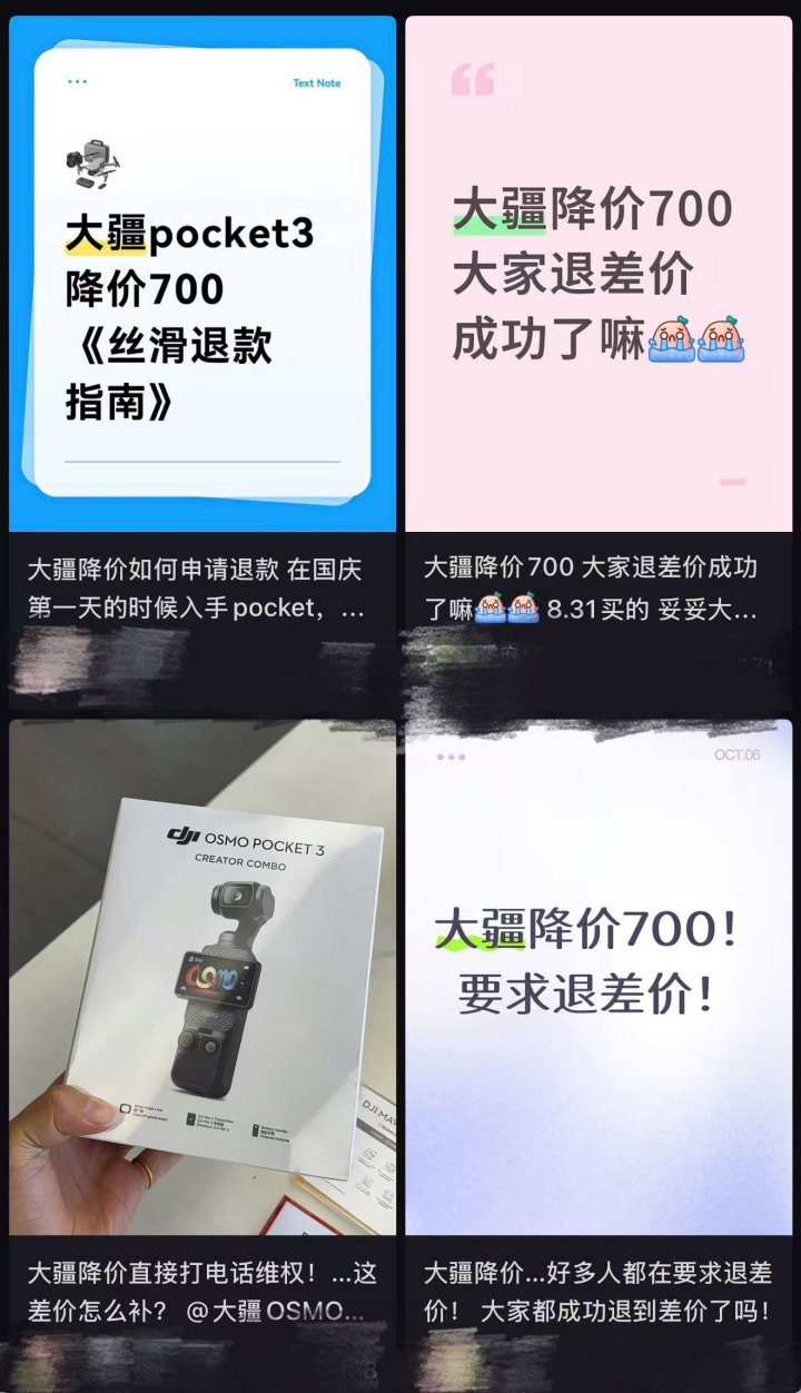相关消息一出,即引起网友热议。不少最近购买了大疆产品的网友纷纷在小红书等社交平台上表示,被“背刺”了。另有许多网友在社交平台上询问及分享如何以“退差价”的形式维权。