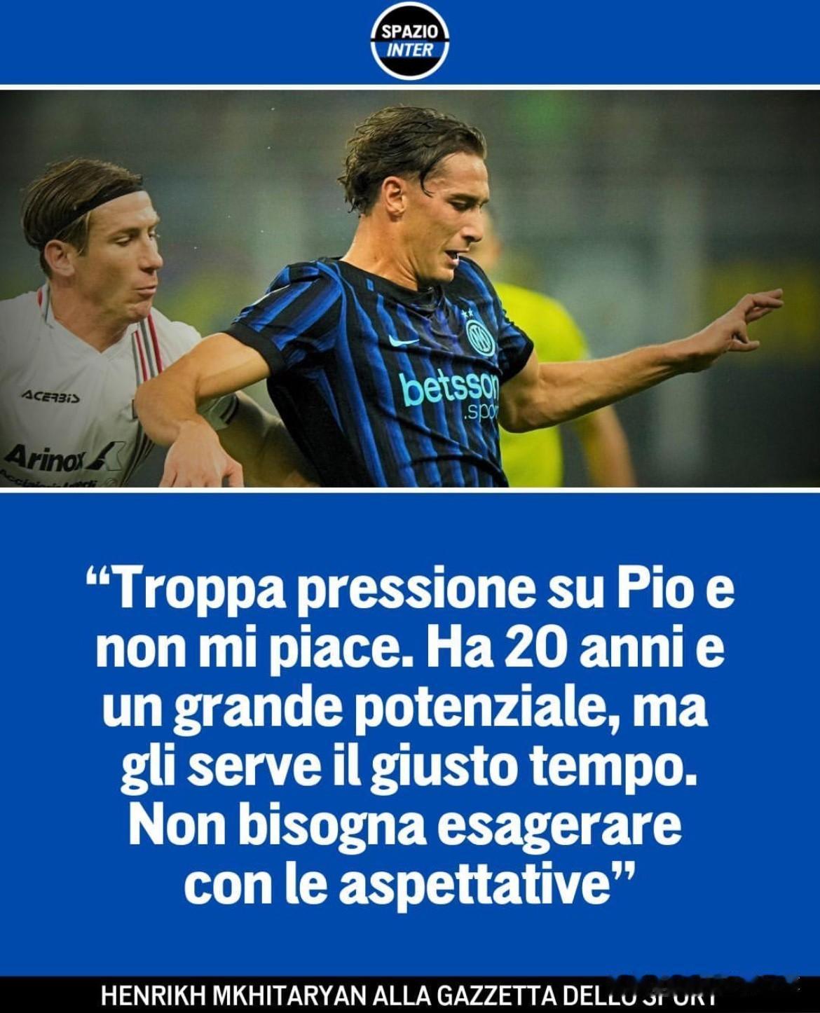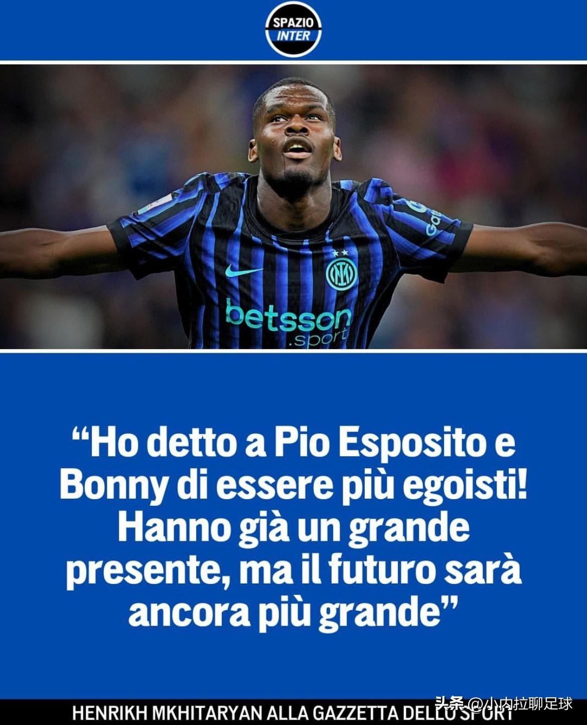 中肯,实话实说!国米空间:“驴二”展望蓝黑未来! 姆希塔良在接受米体采访时,谈到了自己和球队(成员)的未来,他表示:我知道我没有像以前那样连续地比赛了,我也理解,快到37岁了;让一些年轻球员上场是正常且正确的,他们是俱乐部的未来;苏契奇有实力和个性,他将成为国际米兰的幸运之星。 还有就是,目前对三埃(皮奥)的压力太大了,我不太喜欢这样;他才20岁,有着巨大的潜力,但其需要合适的时间;我告诉他和博尼,你们可以“自私”一点! 最后,我们本赛季的目标还是只有一个:第一;那不勒斯去年赢得了意甲冠军,但我们也不能否认自己也是热门之一:这的确不会轻松,但大家会全力以赴,把三色旗(意甲冠军)夺回来的!