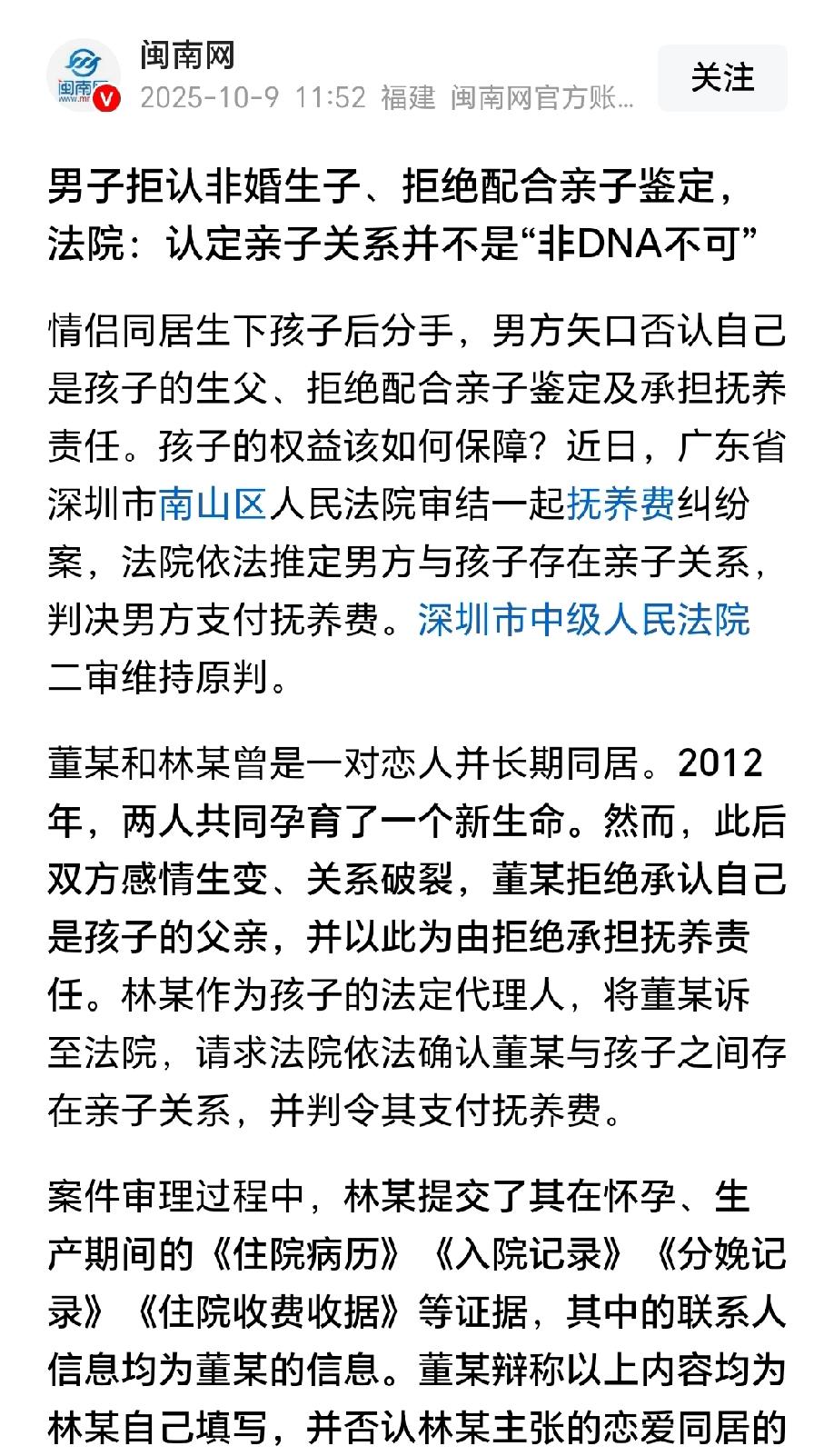 广东深圳,男子和女友长期同居并生育了一个孩子,没想到,孩子的到来不仅没有促进感情,反而让双方感情产生裂痕,闹到分手的地步。男子拒绝承认是孩子 的生父,也不配合做亲子鉴定,更是拒绝支付抚养费。女友一气之下告上法庭,法院的判决让男子意向不到。 2012年的夏天,林女士抱着刚出生的孩子,看着这个爱情的结晶,她以为日子会越来越好,男友董某一定会承担起丈夫和父亲的责任。 可她没料到,这段同居恋情会在孩子出生后急转直下,最后闹到对簿公堂。 两人原本是恋人,同居后林女士怀孕,董某一开始也陪着去产检,可孩子落地后,感情却莫名生了裂痕。 吵到最后,董某干脆翻脸不认人,嘴唇一碰就说孩子不是他的,连抚养费都一分不肯出。 林女士又气又急,她没想到董某这么没担当,同居的时候甜言蜜语哄着她要孩子,现在有了孩子,他却吃干抹净就像溜走。 跟气人的是,董某不想支付抚养费就算了,竟然还说孩子不是他的,这么污蔑她的清白,林女士实在气。 林女士也曾做出过让步,既然董某不放心,请带着孩子去做个亲子鉴定,这样也好还她一份清白。 可谁能想到,董某又耍起了无赖,拒绝去做亲子鉴定,这不就是对自己的话心虚嘛。 抱着襁褓里的孩子,林女士看着空荡荡的家,决定起诉董某,就算为了孩子,她也得要个说法。 到了法院,董某的态度更强硬。 法庭上,面对林女士拿出的怀孕、生产时的住院病历、收费收据,董某一口咬定,这些都是林女士代他填的信息,不算数。 不仅如此,董某当着法官的面,连两人曾经同居恋爱的事实都矢口否认。 林女士看到董某这样死鸭子嘴硬的行为,只能申请法院调取孩子的出生医学证明,没想到这一调,还真调出了关键证据。 医院的存根上明明白白写着孩子父亲是董某,下面还有他亲笔签的名字。 更关键的是,医院还提供了当时的剖宫产手术知情同意书,上面也是林女士和董某两人的签名。 林女士拿着证据质问董某,这些总不能是我伪造的吧?然而董某却还是不松口,坚持没有亲子鉴定报告,他就是不认这个孩子。 林女士没办法,只好再次申请做亲子鉴定,想着用科学说话。 可董某既不承认这个孩子,又拒绝做亲子鉴定,以为这样就能让法官没有办法,摆明了要“耍赖到底”。 法官认为,董某拒不做亲子鉴定,只能推定亲子关系。 最高人民法院关于适用《民法典》婚姻家庭编的解释(一)第39条规定:父或者母以及成年子女起诉请求确认亲子关系,并提供必要证据予以证明,另一方没有相反证据又拒绝做亲子鉴定的,人民法院可以认定确认亲子关系一方的主张成立。 林女士为证明亲子关系提交了多重关键证据,法院调取的《出生医学证明》存根也有董某的亲笔签名,明确记载其为孩子父亲,表明董某全程参与林女士生产过程并认可亲属身份。 而董某不仅否认恋爱同居事实,辩称证据系林女士代填,却未提供任何书面凭证或证人证言等相反证据,同时以沉默方式拒绝配合亲子鉴定。 按照推定规则,法院可以认定董某与孩子的亲子关系成立。 《民法典》第1071条规定:非婚生子女享有与婚生子女同等的权利,任何组织或者个人不得加以危害和歧视。不直接抚养非婚生子女的生父或者生母,应当负担未成年子女或者不能独立生活的成年子女的抚养费。 董某以双方未结婚、否认亲子关系为由拒绝支付抚养费,实质是忽视非婚生子女的法定权利。 法院在推定亲子关系成立后,董某对孩子就负有法定抚养义务。 董某作为生父,对未成年子女的抚养义务系法定义务,不因感情破裂或身份否认而免除。 《民法典》第1073条规定:对亲子关系有异议且有正当理由的,父或者母可以向人民法院提起诉讼,请求确认或者否认亲子关系。 司法实践中,正当理由需结合客观证据综合判断,DNA鉴定并不是必要手段。 董某以无亲子鉴定报告为由否认亲子关系,但林女士提交的住院病历、手术同意书、出生医学证明等证据,均能印证董某在孩子出生时以父亲身份参与全程,其当时的认可具有高度可信度。 这些证据形成的完整链条,已达到“高度盖然性”的民事证据标准,足以替代亲子鉴定的证明效力。 法院审理认为,董某既拿不出相反证据反驳,又拒绝配合做亲子鉴定,林女士提交的证据足以推定董某是孩子的父亲。 最后,法院不仅确认了董某和孩子的亲子关系,还判决董某每月按时支付抚养费。 董某不服气上诉,可市中院二审依旧维持原判。不管他怎么躲,身为父亲的责任,终究逃不掉。