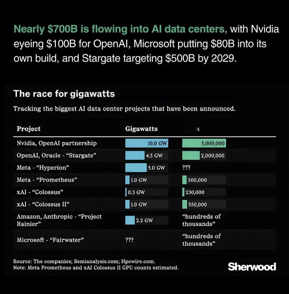 据内部估算,OpenAI 未来十年将部署超过 20GW 算力,相当于 20 座大型核反应堆的发电量。按每 1GW 成本 500 亿美元计算,这意味着 1 万亿美元的投入。合作方包括英伟达、甲骨文、CoreWeave 和 AMD 等。