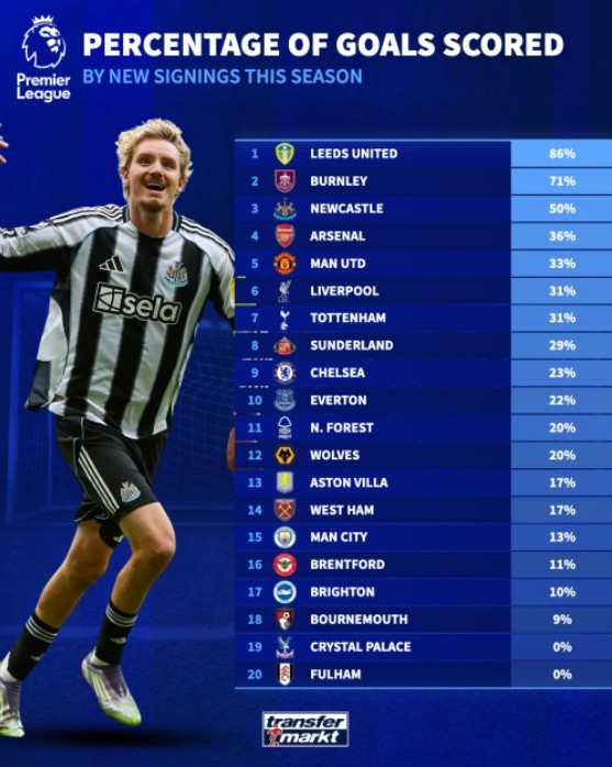 直播吧10月9日讯新赛季英超已经进行了7轮比赛,20支球队今夏新援作用如何?德国转会市场盘点了各队新援进球数占球队总进球数的比例情况,其中利兹联86%最高,阿森纳、曼联、利物浦分列位居第4、第5和第6。