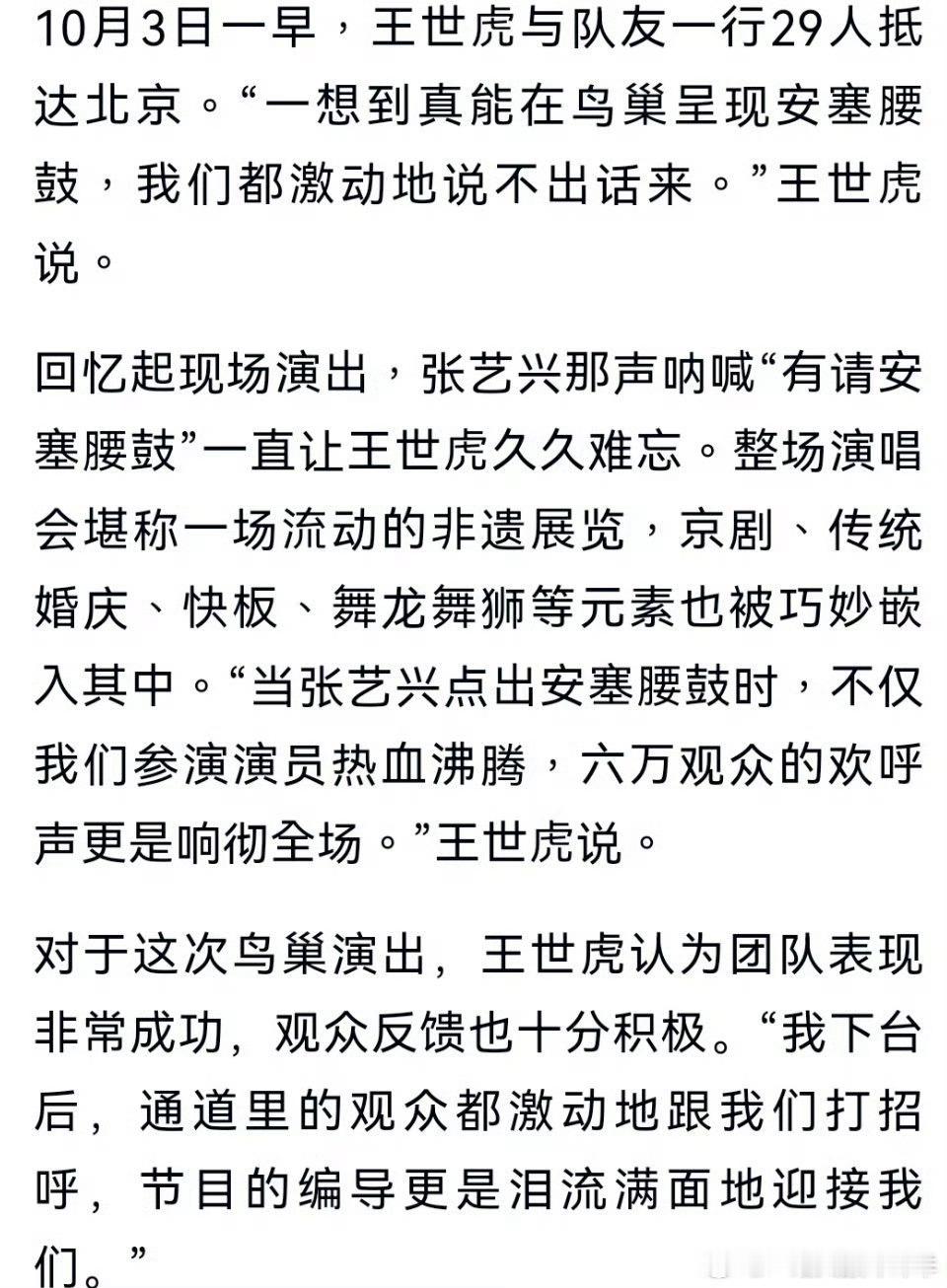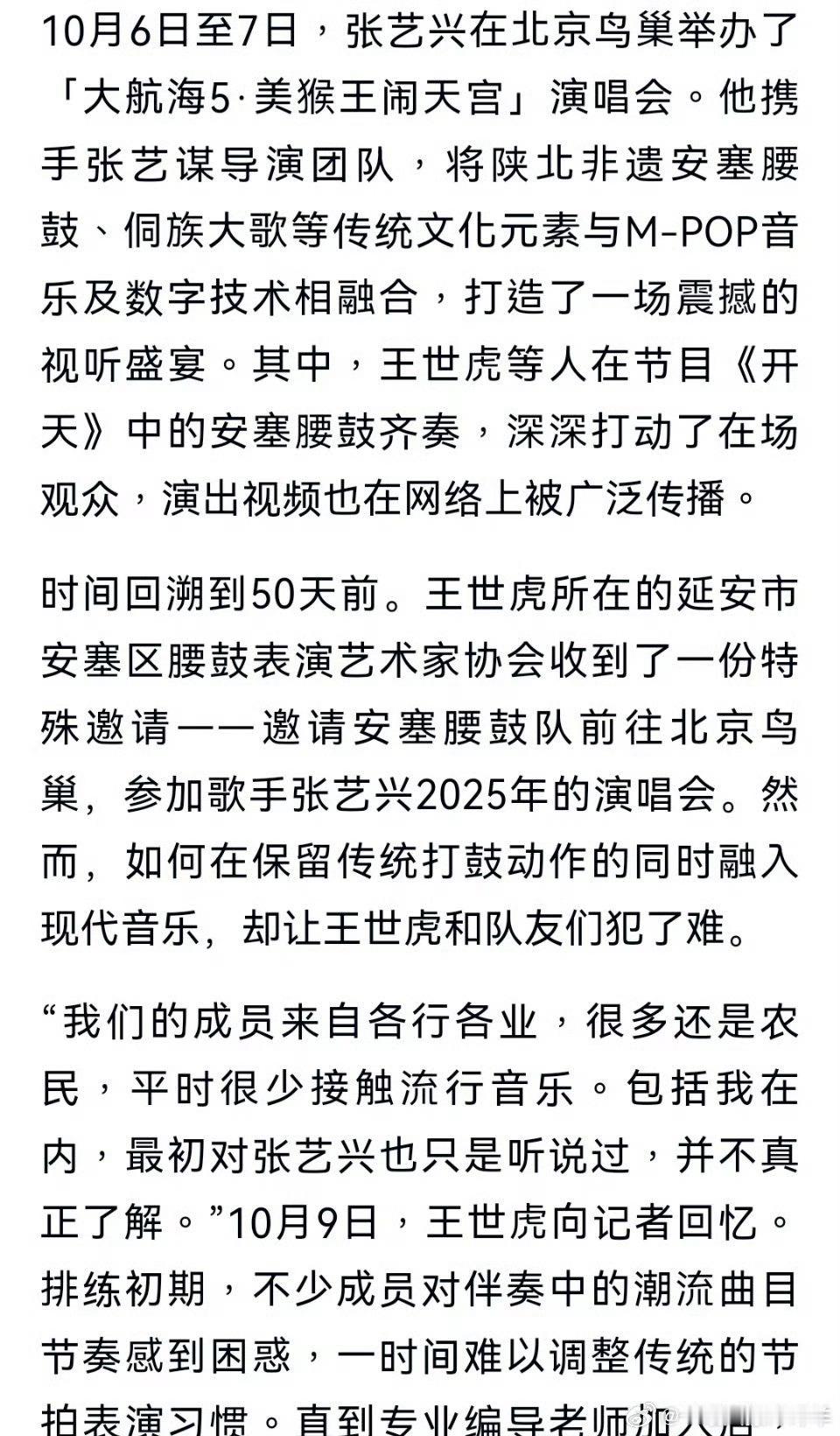 媒体报道!张艺兴在演唱会巧妙融入安塞腰鼓、京剧、快板等非遗元素,打造“流动的非遗展览”,其中“有请安塞腰鼓”的呐喊令舞者与六万观众热血沸腾,也让安塞腰鼓从传统节日演出走向与潮流音乐结合的全新领域[努力] 海外推特单帖有万转和近四百万浏览量!!万赞帖数不清!! 外国人褒言:张艺兴的演唱会让我意识到我们落后中国100年了 !