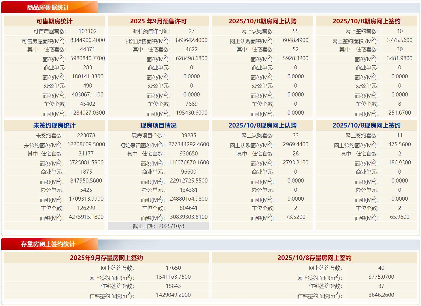 根据北京市住房和城乡建设委员会数据:10月8日,北京新房住宅网签32套,网签面积约3,668.91㎡;二手房住宅网签37套,网签面积约3646.26㎡。