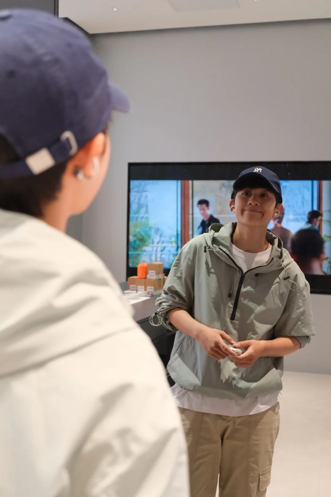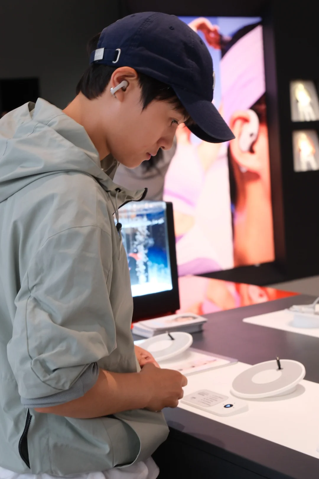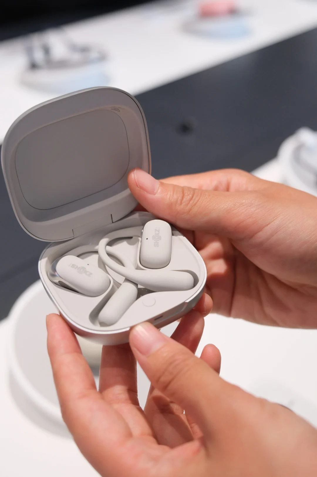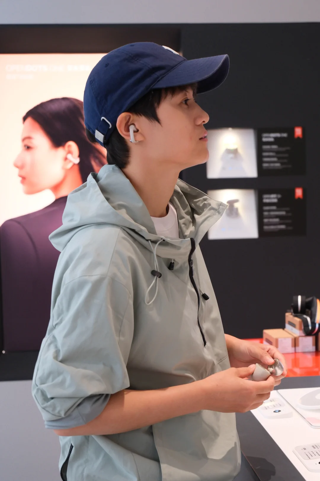 店内的两款新品让我印象深刻。新出的耳夹式耳机OpenDots ONE柔雾粉,还是田曦薇同款,颜值超高。