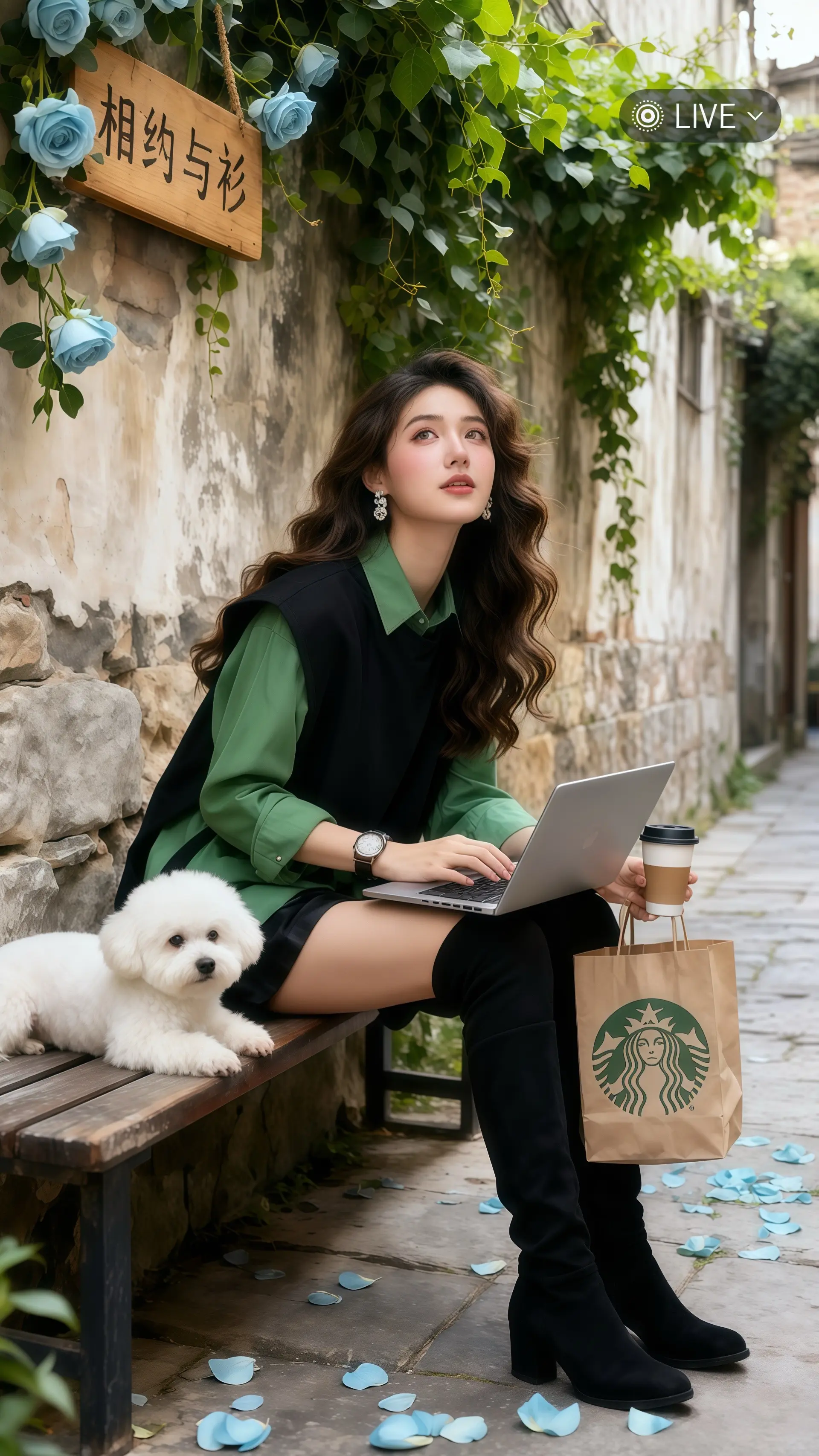 她穿着设计感披肩针织叠穿衬衣两件套,往复古街道的女装店门前一站,就成了道亮眼的风景。这两件套很有意思,黑色披肩针织随性又有范儿,叠上绿色衬衣,休闲中带着精致。配着黑色短裤和过膝长靴,走在满是淡蓝色花瓣的街道上,身后是爬满绿藤蔓、挂着淡蓝色玫瑰的古旧石墙,旁边还跟着只可爱的白色比熊犬。这般穿搭,逛起女装店来,既舒服又时髦,就像为这复古街道量身定制的风格,普通人也能轻松穿出高级感,逛街的心情都跟着明媚起来。