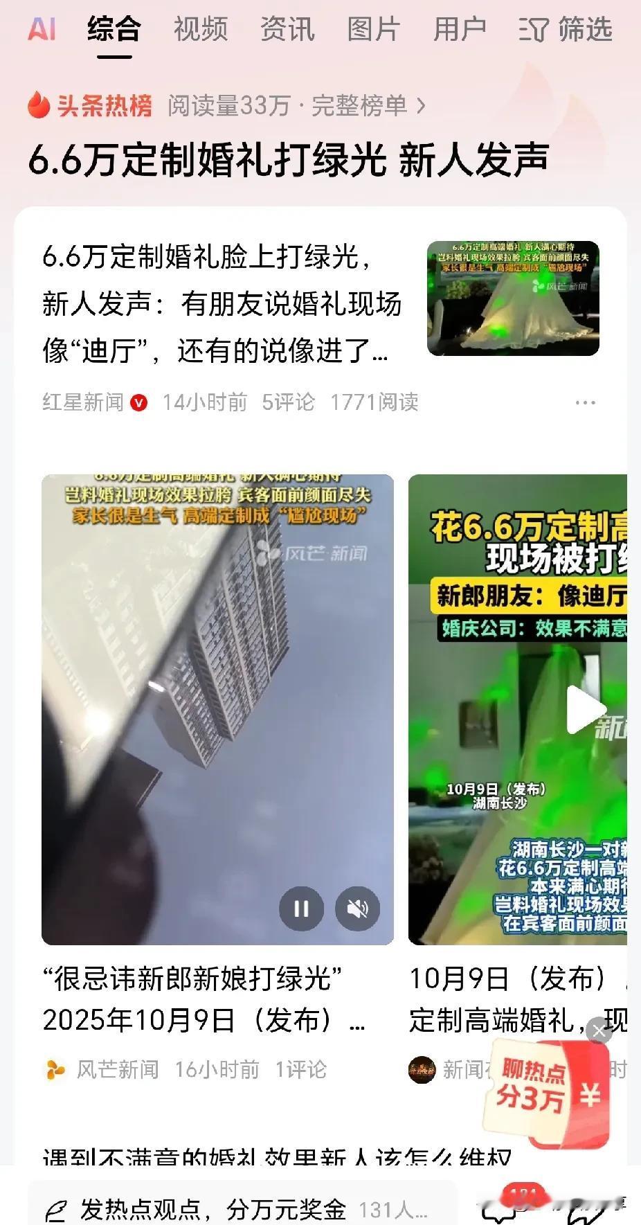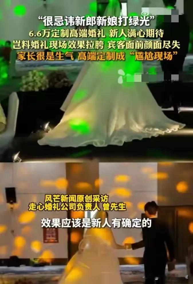 现在全网最闹心的, 应该就是湖南长沙的这对新人了吧, 自己满心欢喜,花了6.6万的高定婚礼现场,竟成了“龙宫”! 10月9日,湖南长沙,6.6万定制高端婚礼,新人满心期待,岂料婚礼现场效果拉胯,宾客面前颜面尽失。新郎新娘被打绿光,“灯光设计花了9800元,最后就给我们呈现了这样的效果,不用打码都认不出新郎是谁。” 有朋友说婚礼现场像“迪厅”,还有的说像进了“龙宫” 有网友戏谑,这是要想生活过得去,必须来点绿吗?哈哈哈,原谅我不怀好意的笑了! 这婚庆公司也真是醉了,传统中国红不香吗?非得搞个绿色,在这么喜庆的日子里,难免不让人膈应。 虽然颜色没有高低贵贱之分,但是不同的场合,使用恰当的颜色,这是生活常识吧! 事前,婚庆公司肯定也和当事新人确认过现场灯光效果,但是,这真的太离谱了! 说到底,还是西式婚礼闹出来的。如果是中式婚礼,再怎么也不会闹出这样的“笑话”出来吧! 大家觉得呢?