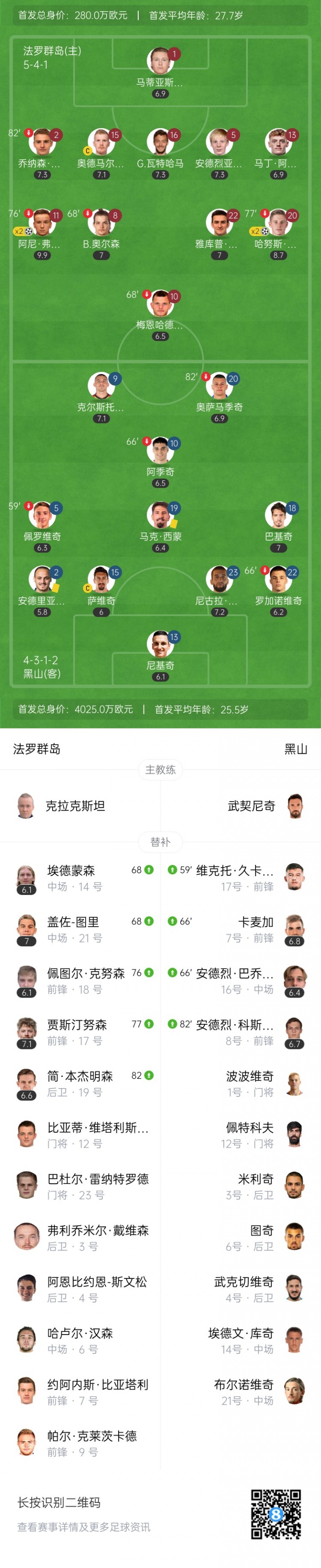 对比两队的阵容,法罗群岛的首发11人身价仅280万,大部分球员都在本国联赛效力;而黑山锋线坐拥两位在意甲效力的球员,亚特兰大的克尔斯托维奇和尤文的阿季奇,首发11人身价4025万欧。