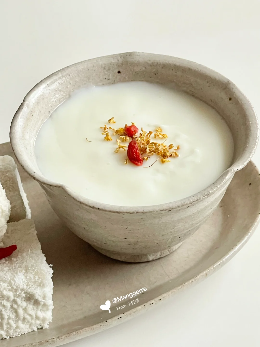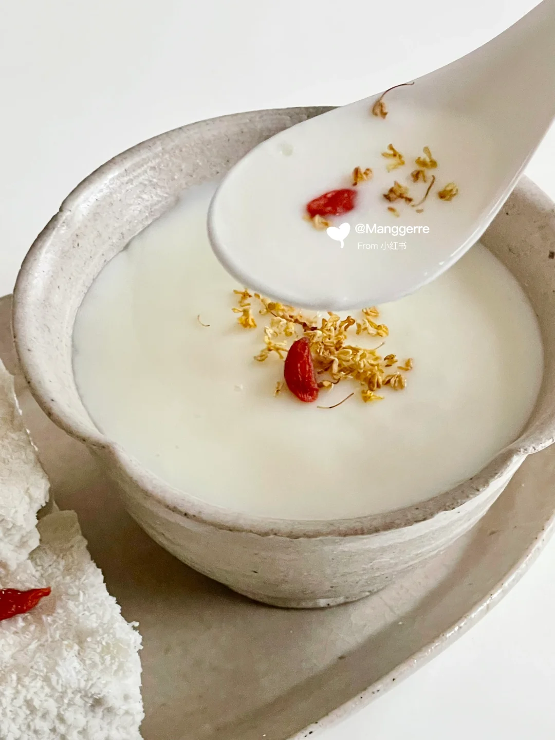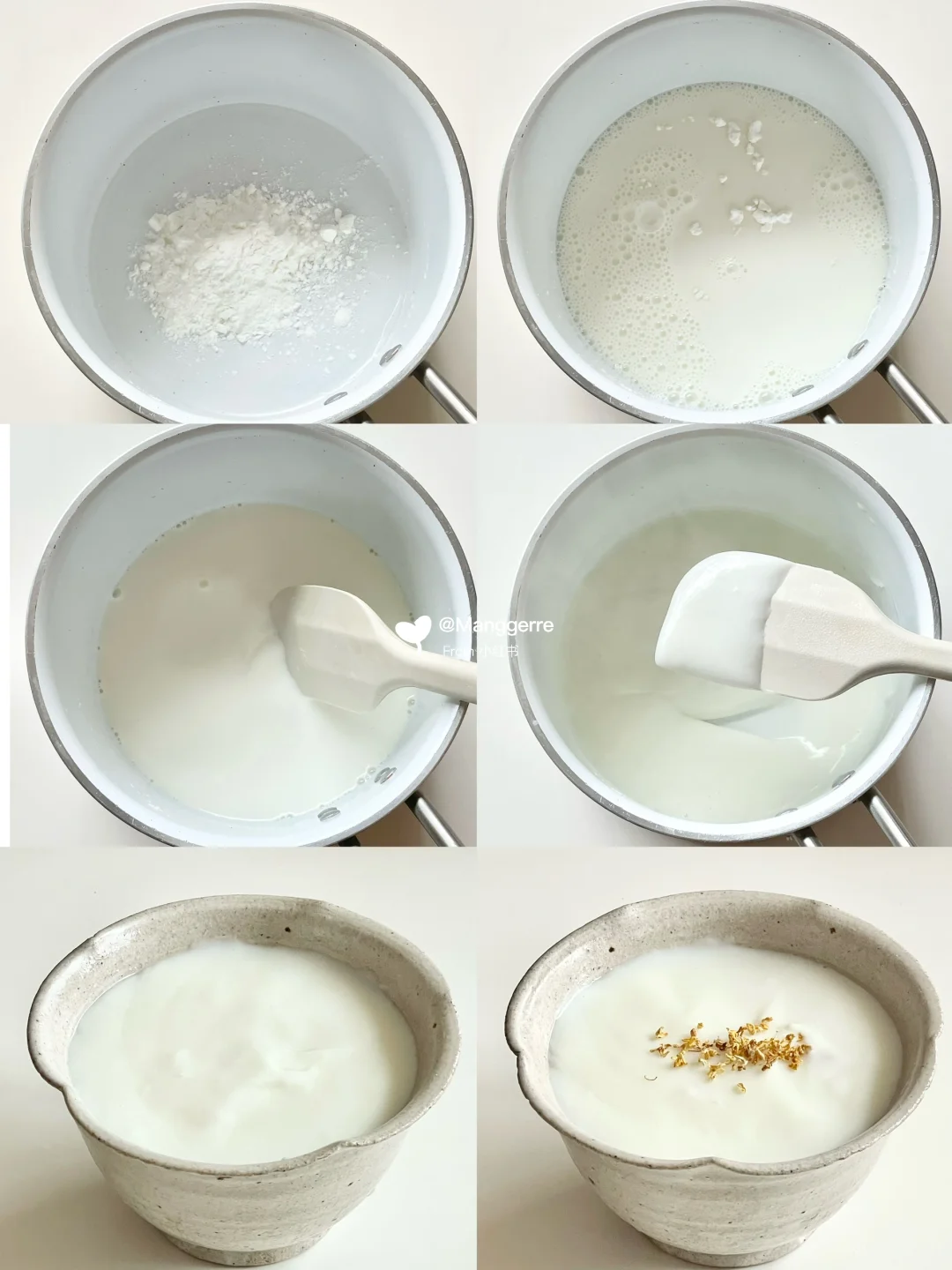 杏仁霜、牛奶加入锅中小火慢煮成糊状,干桂花装饰即可食用。