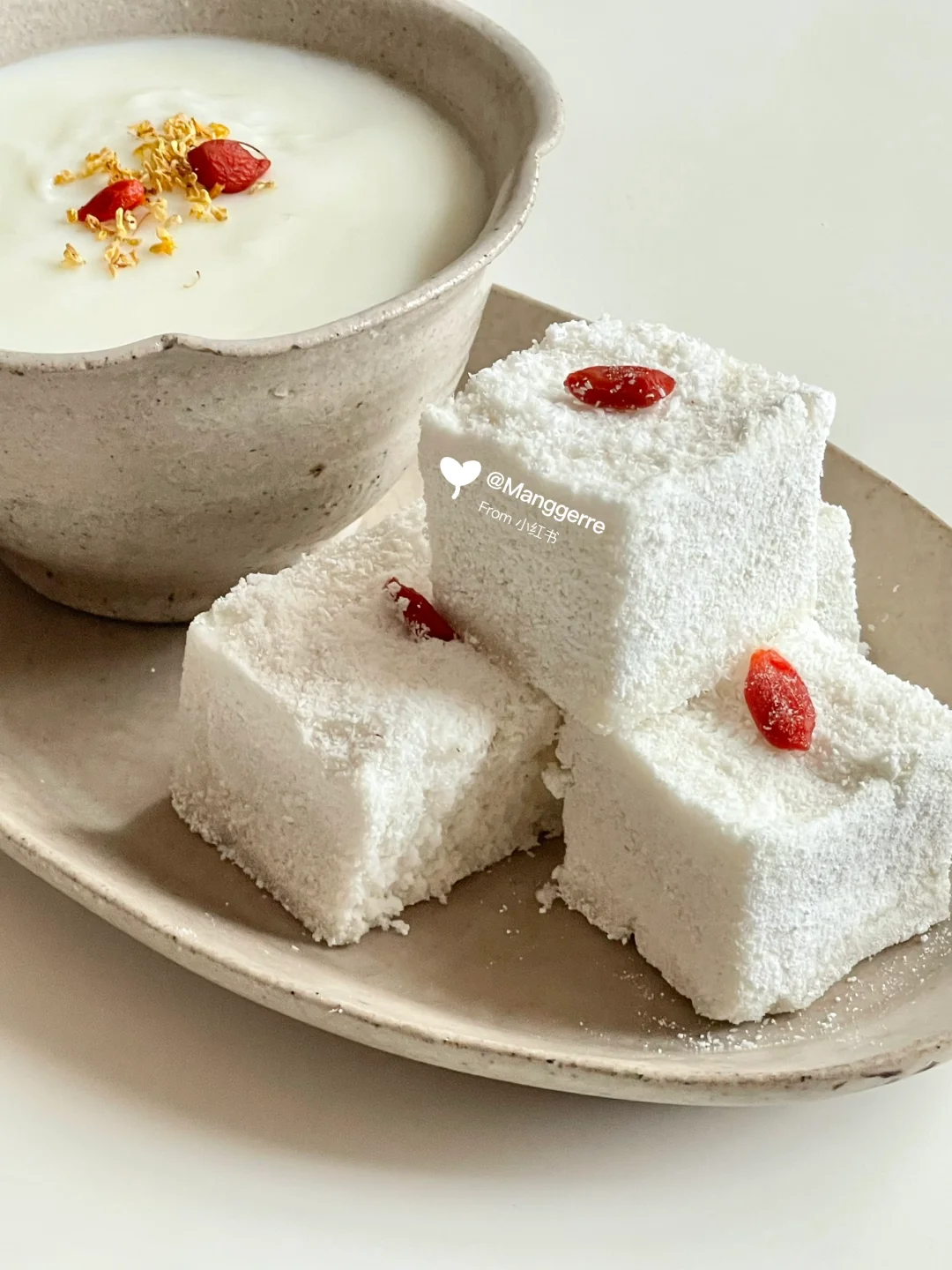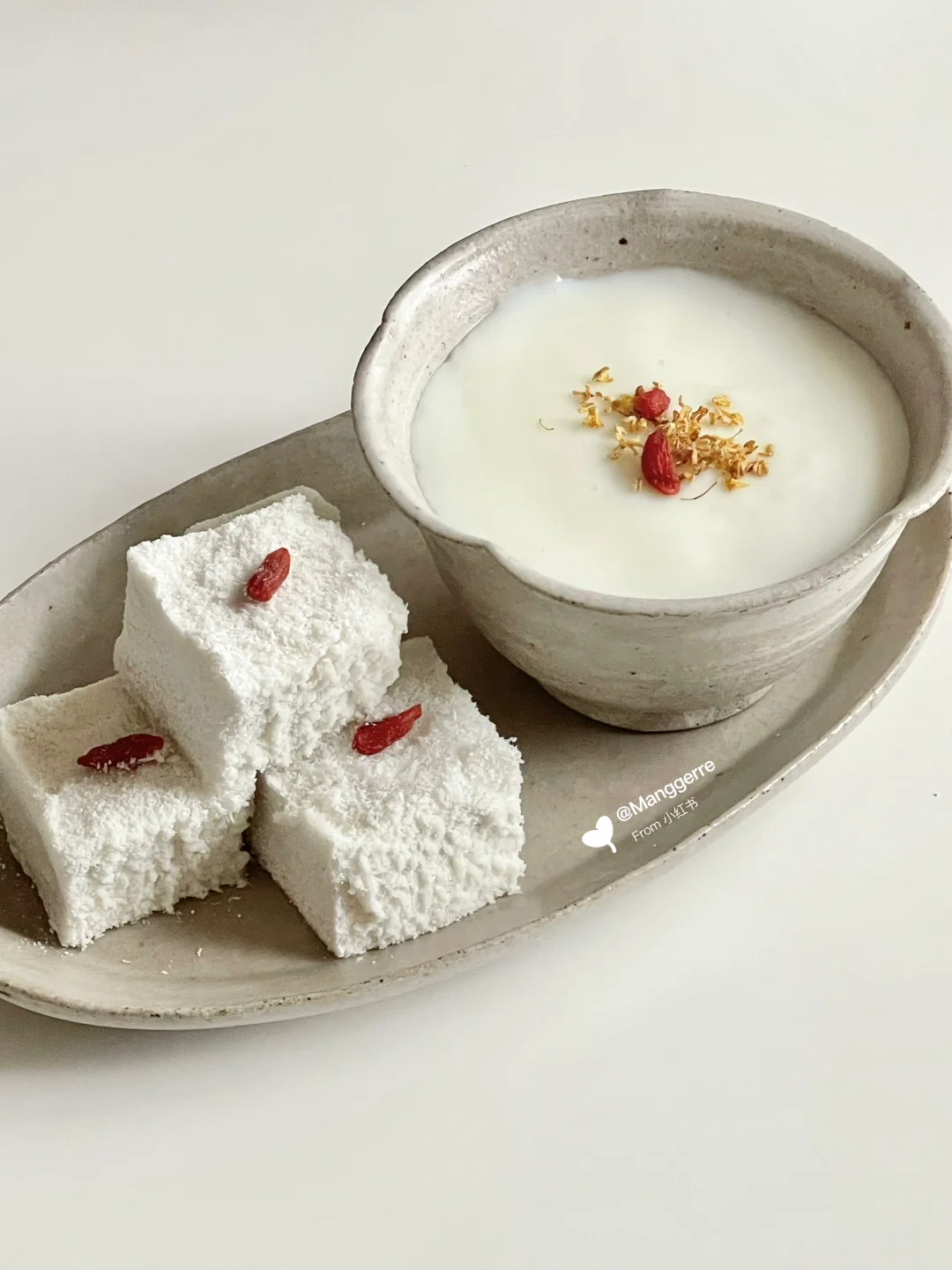 白玉糕如凝脂初雪,轻咬一口,温润绵密似云絮化开,舌尖漫开清甜米香,若隐若现的椰蓉如星子点缀。杏仁霜丝绸般柔滑质地,浅抿一匙,杏仁清香裹挟着奶香层层漾开,热吃甘润香甜。