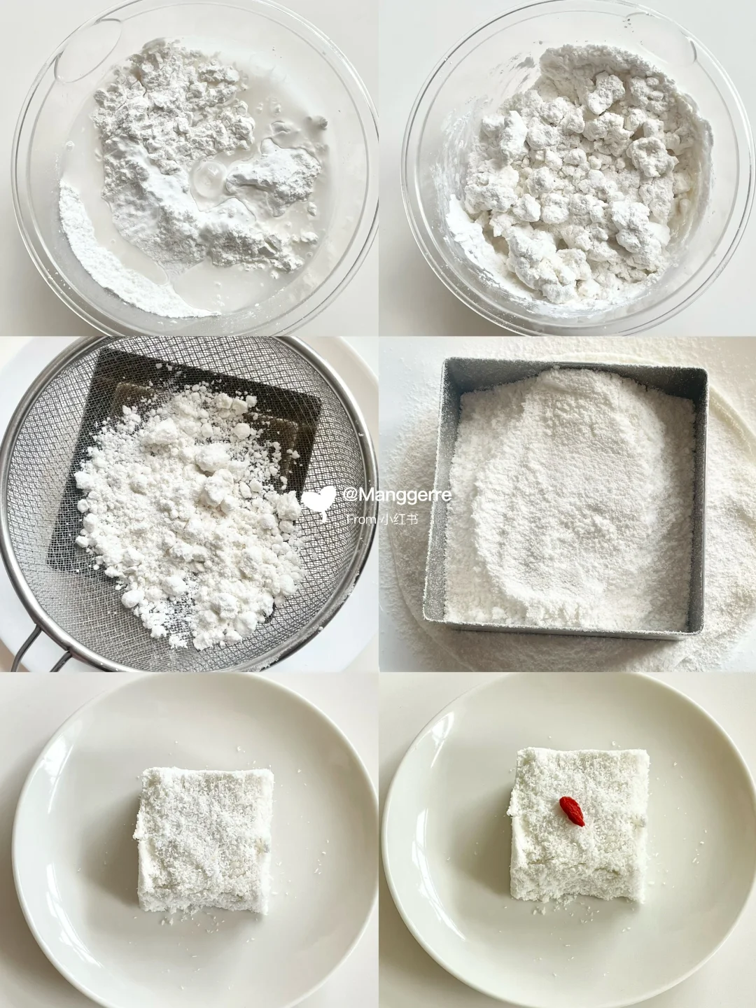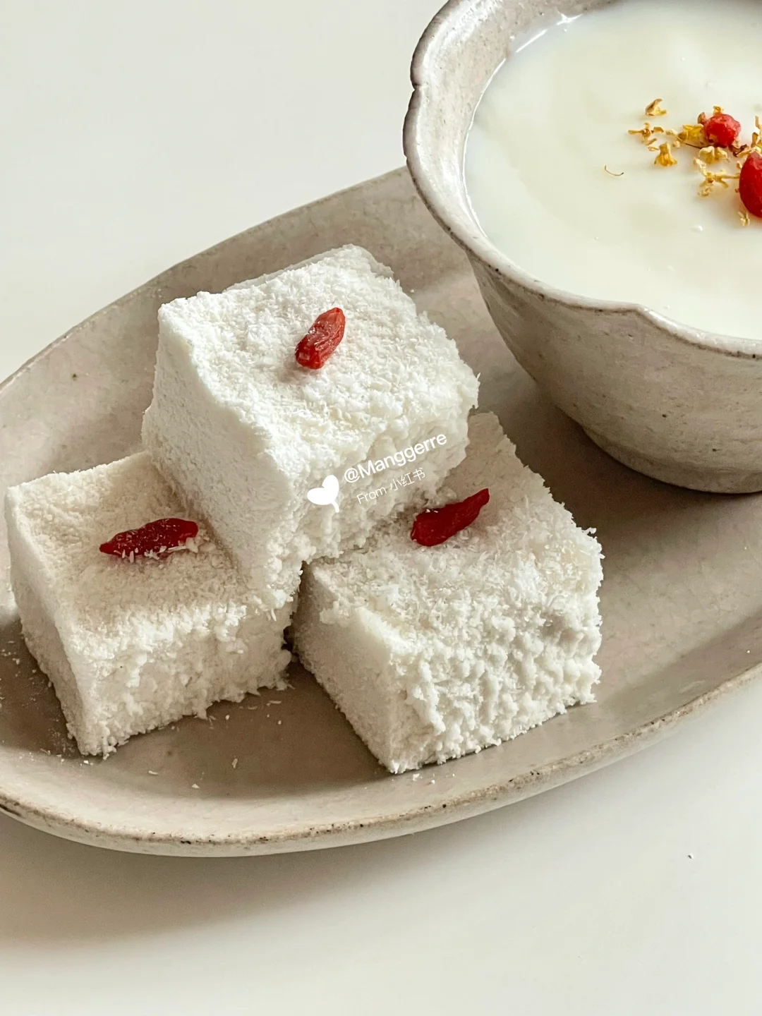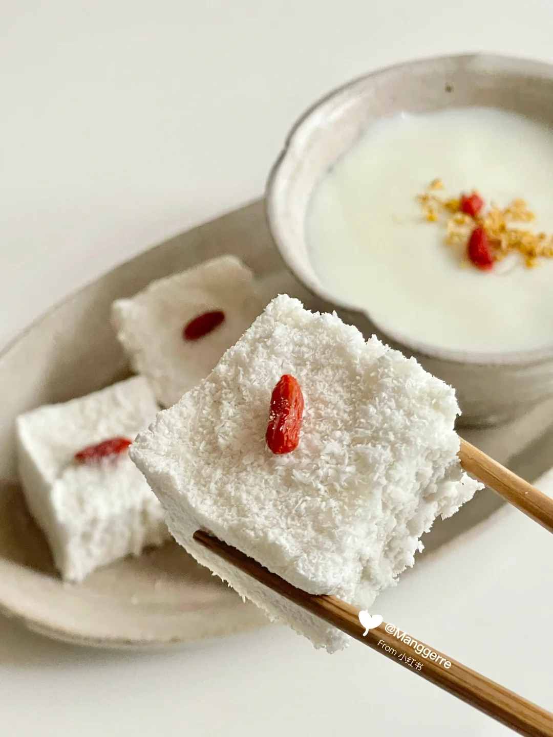 3、蒸好的米糕裹上椰蓉,枸杞装饰