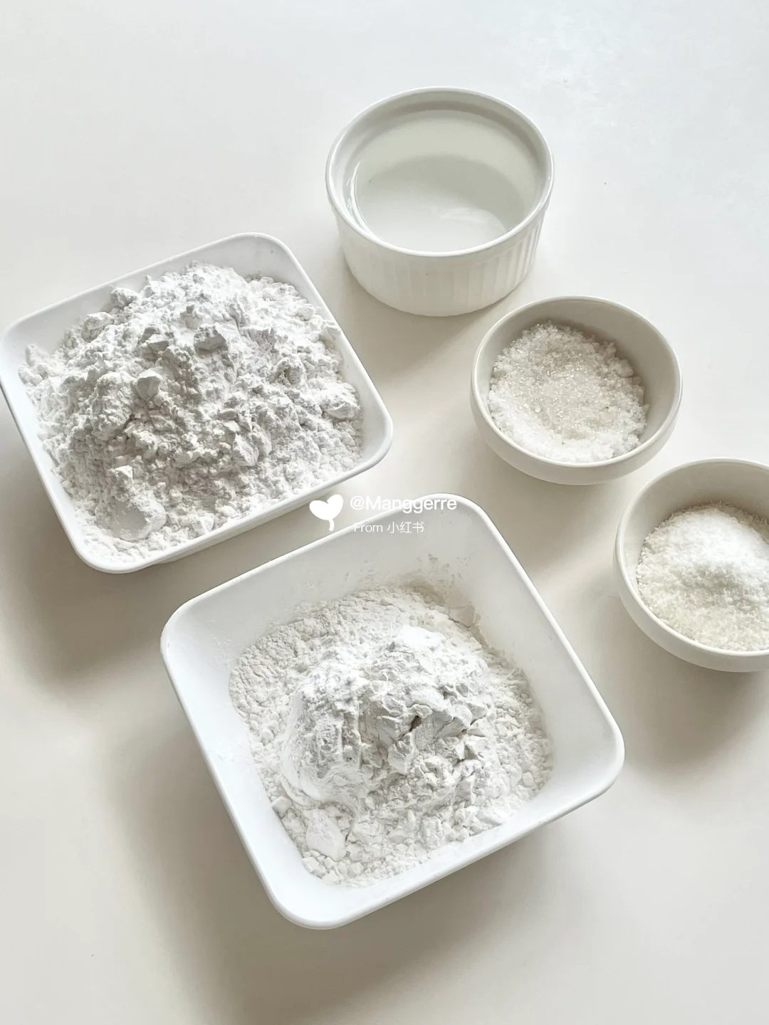 1、糯米粉、粘米粉混合,糖加入温水中融化开倒入米粉种搅拌