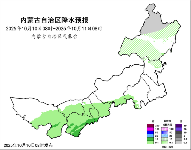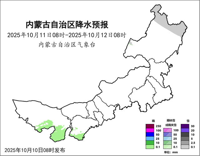10月10日至11日,阿拉善盟东南部部分地区、鄂尔多斯市南部和东部、呼和浩特市南部有中雨;中西部偏南地区局地有雾;东北部偏北地区有霜冻或冰冻。