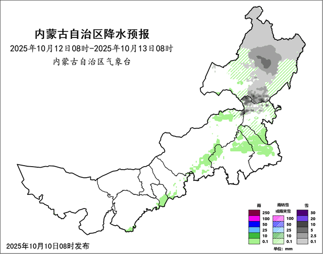 10月11日,内蒙古大部无降水,仅在西部偏南、东北部偏北地区有小雨或小雪现身。12日,随着冷空气的到来,西部偏东南、中部偏南和偏东北、东北部和东南部偏北地区将有分布不均匀的小雨、雨夹雪或小雪,其中,锡林郭勒盟东北部部分地区、兴安盟北部、呼伦贝尔市中部和南部部分地区有中雪或雨夹雪,局部地区有大雪,部分地区还有大风袭扰。