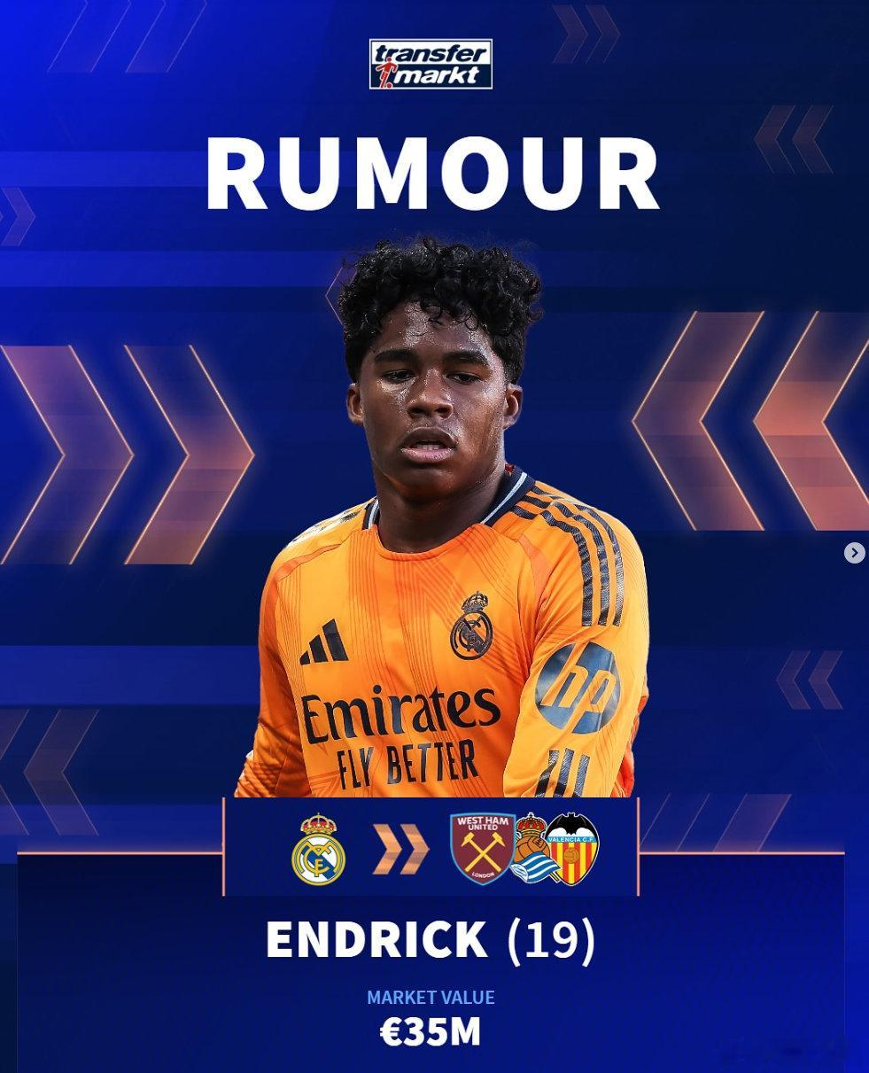 【没机会】西班牙媒体:19岁的皇马前锋恩德里克本赛季在阿隆索手下没有获得一分钟的出场时间,他在冬窗离队锻炼的可能性非常大,目前有西汉姆,皇家社会,瓦伦西亚等队表示出了兴趣。