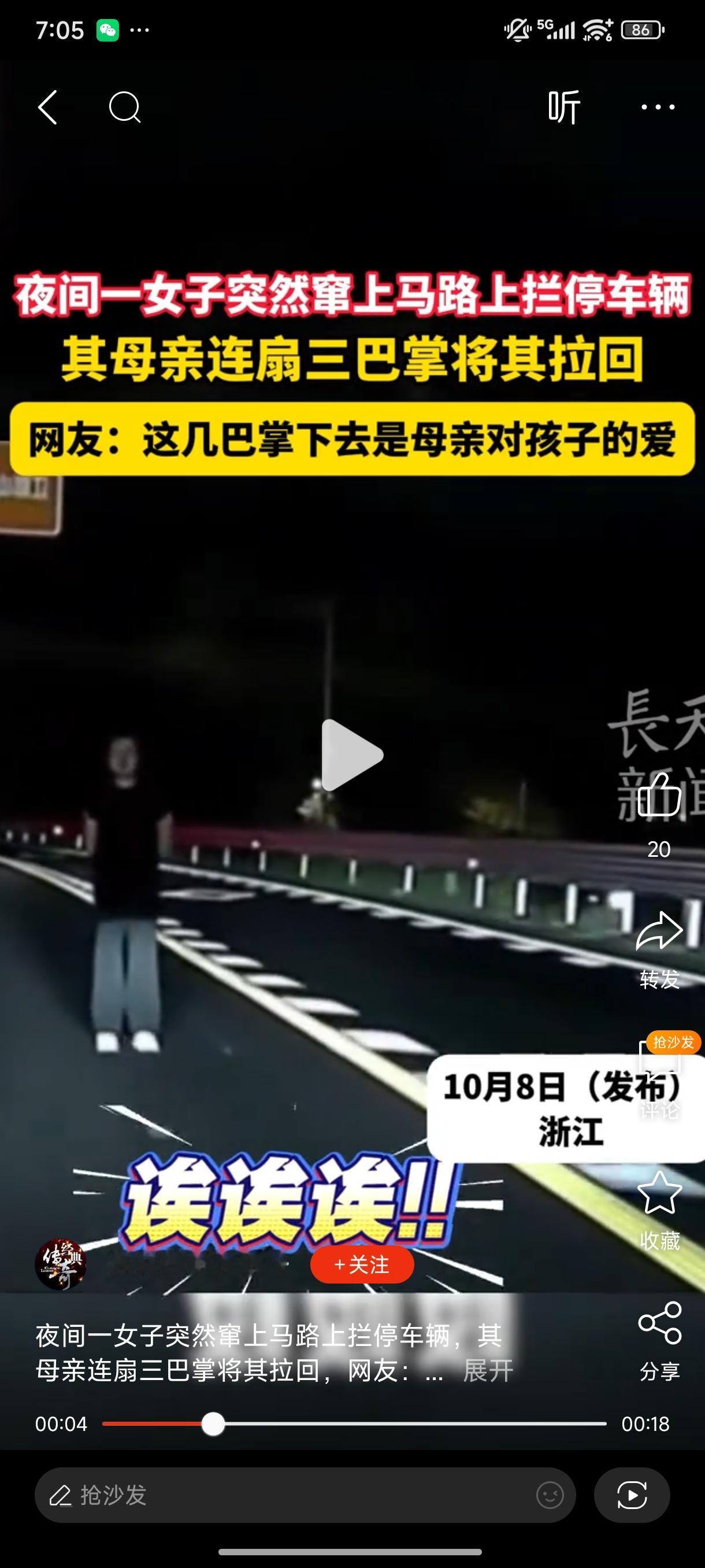 “啪啪啪”,浙江,夜间一女子突然窜上马路上拦停车辆,其母亲连扇三巴掌将其拉回。网友:这几巴掌下去是母亲对孩子的爱。 10月8日晚,浙江的夜幕如墨,车流在城市主干道上平稳穿行,车灯划破沉沉夜色。 突然,一名女子毫无征兆地从路边窜出,张开双臂站在马路中央,径直拦停了一辆疾驰而来的轿车。 刺耳的刹车声在寂静的夜里格外尖锐,司机惊出一身冷汗,而女子却似浑然不觉,仍在车流中僵持。 就在这千钧一发之际,一位中年母亲从路边狂奔而来,脸上写满了惊恐与焦灼。 她没有多余的言语,冲到女子身边,扬起手便朝着女儿的脸颊连扇三巴掌。 清脆的巴掌声在街头回荡,每一下都带着不容置疑的力量。女子被打得一个趔趄,眼神中的执拗渐渐褪去,母亲趁机死死拽住她的胳膊,将她连拉带拽地带回了人行道,紧紧护在身后。 这段偶然被行车记录仪拍下的视频,一经上传便引发了网友的热烈讨论。 有人最初质疑母亲的教育方式过于粗暴,但在看清女子身处的险境后,评论区的风向逐渐转变。“这哪里是巴掌,分明是把女儿从鬼门关拉回来的力气”“打在女儿身上,疼在母亲心里,这三巴掌全是后怕”“换作是我,可能比这位母亲打得更狠,比起孩子的安全,谁还顾得上温柔”。 争议的背后,是大众对“爱”的不同解读。有人认为教育应循循善诱,但更多人读懂了母亲那一瞬的绝望——在车辆可能失控的几秒内,没有时间讲道理,没有余地温柔劝说,唯有最直接、最激烈的方式,才能让孩子瞬间清醒。那三记耳光,扇走的是孩子的冲动与危险,留下的是母亲拼尽全力的守护。 当我们隔着屏幕评判教育方式的对错时,或许更该看见那位母亲颤抖的双手、发白的嘴唇,以及将女儿护在身后时,那份如大山般沉重的责任。这份爱,不够优雅,不够温和,却在最危急的时刻,成了孩子最坚实的屏障。