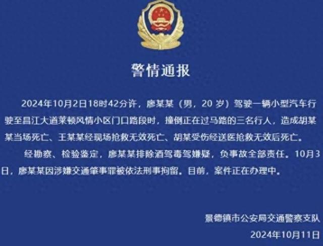 2024年10月2日,在江西景德镇发生了一起一家三口被撞身亡事件。据景德镇市公安局交通警察支队此前发布的警情通报:2024年10月2日18时42分许,廖某某(男,20岁)驾驶一辆小型汽车行驶至昌江大道莱顿风情小区门口路段时,撞倒正在过马路的三名行人,造成胡某某当场死亡、王某某经现场抢救无效死亡、胡某受伤经送医抢救无效后死亡。经勘察、检验鉴定,廖某某排除酒驾毒驾嫌疑,负事故全部责任。据悉,事故中不幸身亡的三人为一家三口,夫妻二人以及一名不满一岁的孩子。