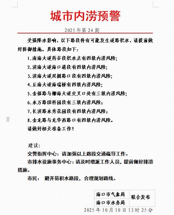 海口市气象台2025年10月10日13时41分发布雷雨大风黄色预警信号:受对流云团影响,海口市13时41分到19时可能出现雷雨大风天气,风力达7~9级并伴有强雷电和局地短时强降水,建议有关单位和人员做好防范工作。