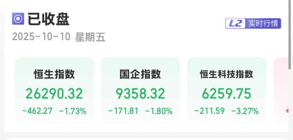 上证报中国证券网讯(卢伊记者严晓菲)10月10日,港股三大指数震荡走跌。截至收盘,恒生指数跌1.73%,报26290.32点;恒生国企指数跌1.80%,报9358.32点;恒生科技指数跌3.27%,报6259.75点。