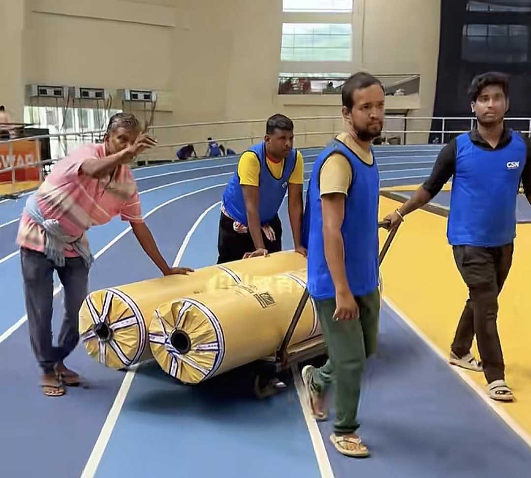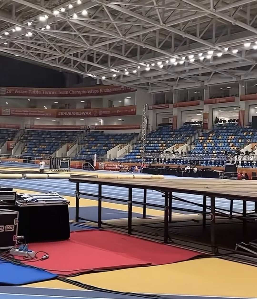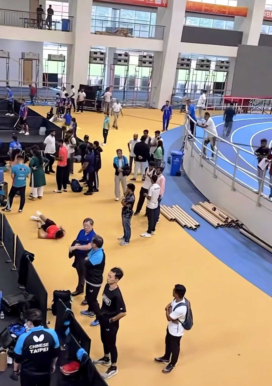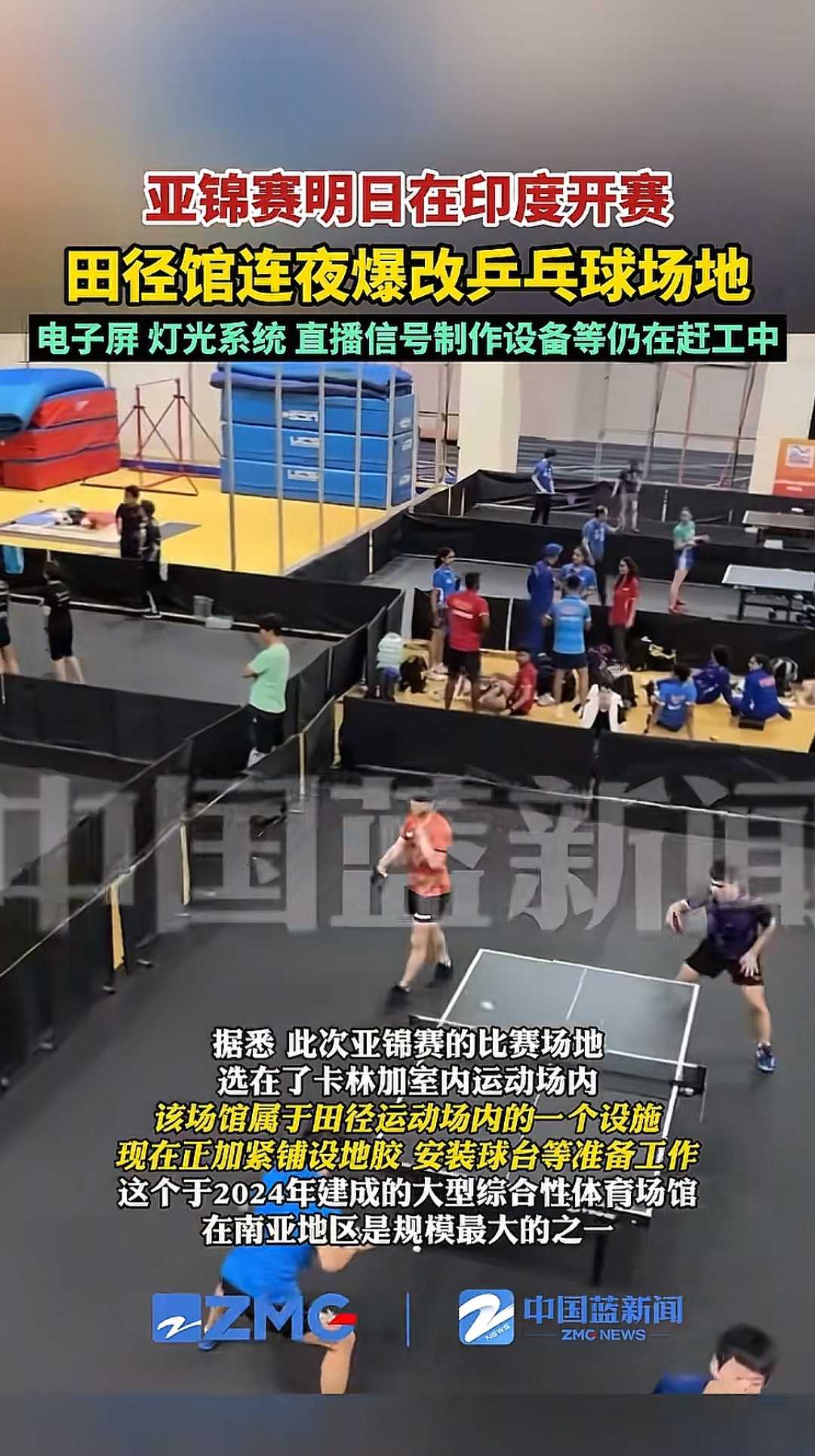 此次乒乓球团体亚锦赛的比赛场馆由当地一座室内田径场临时改造而成。据浙江广电报道,尽管开赛在即,现场仍有工人在紧张铺设地胶、组装设备,整体环境显得较为杂乱。灯光、舞台、电子屏及转播系统等也处于调试阶段,筹备工作尚未完全就绪。