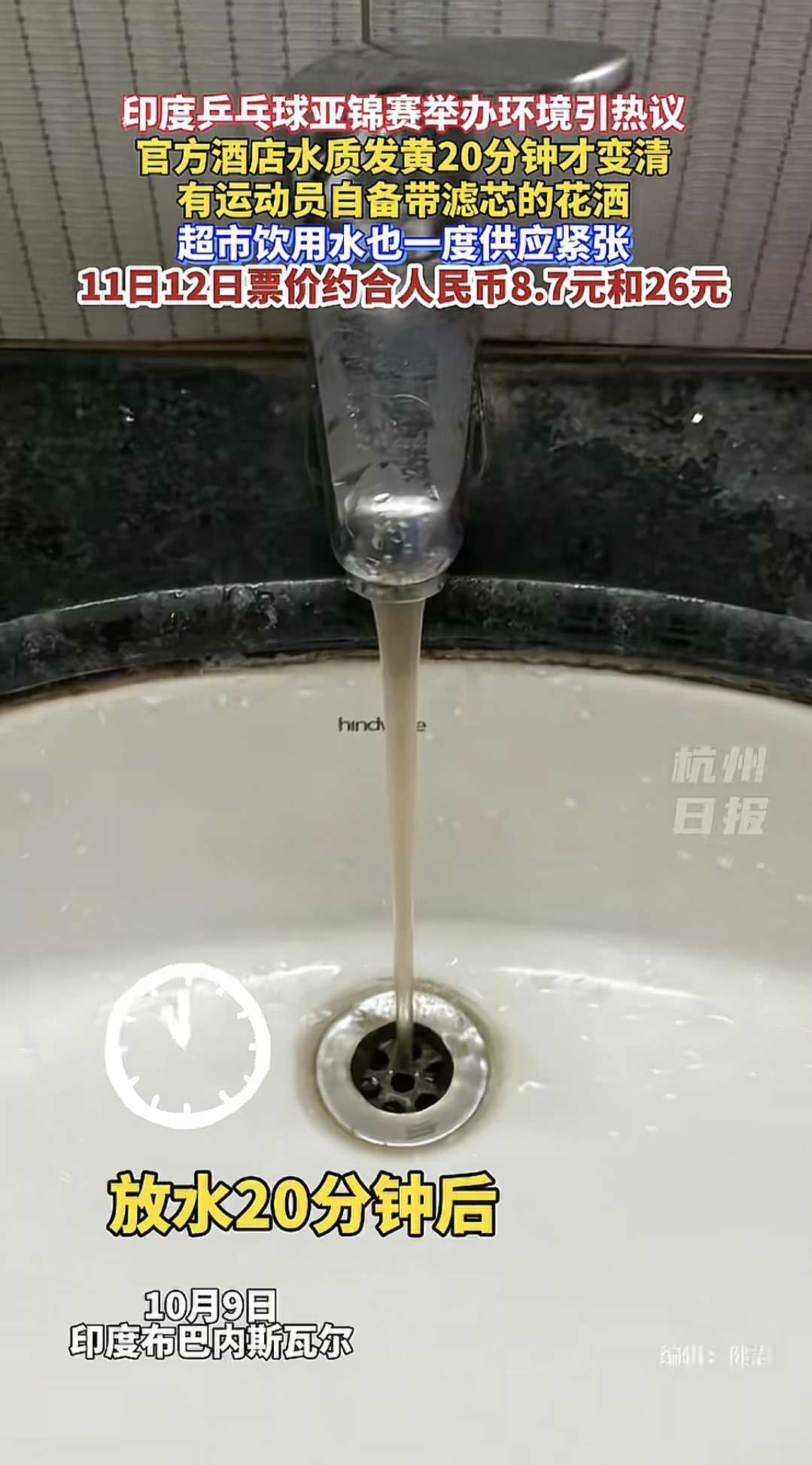 据杭州日报报道,有运动员在社交媒体上吐槽,入住官方接待酒店后,打开水龙头流出的自来水异常浑浊,持续放水20多分钟才逐渐转清。有选手庆幸自己随身携带了过滤花洒,以应对水质问题。